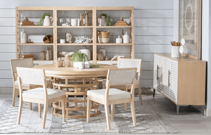 Capture a modern resort feeling with the Biscayne Collection by Legacy Classic | Modern. A light and airy blonde Malabar finish is paired with faux linen-wrapped Alabaster door and drawer fronts and mixed materials to create a serene and stylish setting. Crafted of Quartered Oak Veneers and Hardwoods, the collection offers a clean, fresh aesthetic expressed through organic elements and surface dimension. Design details include pierced and basket weave fronts on cabinets, Travertine Marble insets, silver metal accents and tapered legs, geometric motifs and matte nickel hardware. The 30-piece collection features bedroom, dining, accents, occasional, home office and home entertainment furniture. A signature poster bed has a stunning matte nickel metal canopy that attaches to the upholstered headboard, which has touch lighting at the top for an inviting ambience.