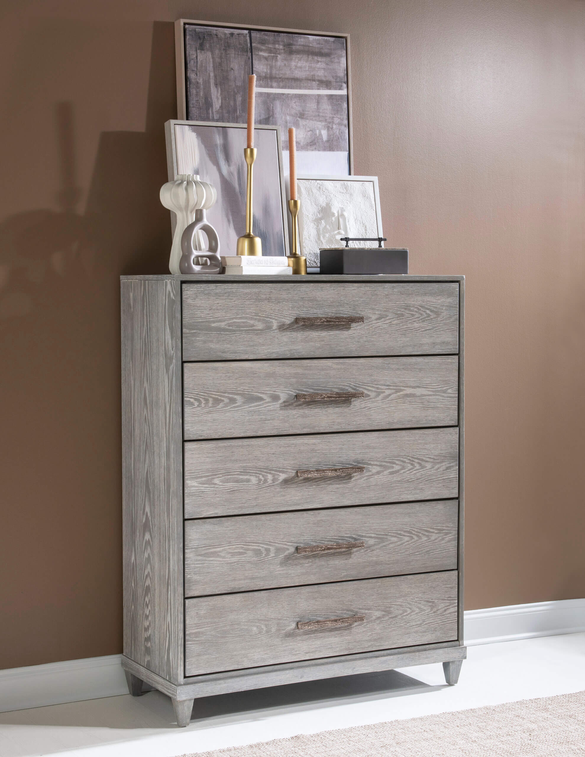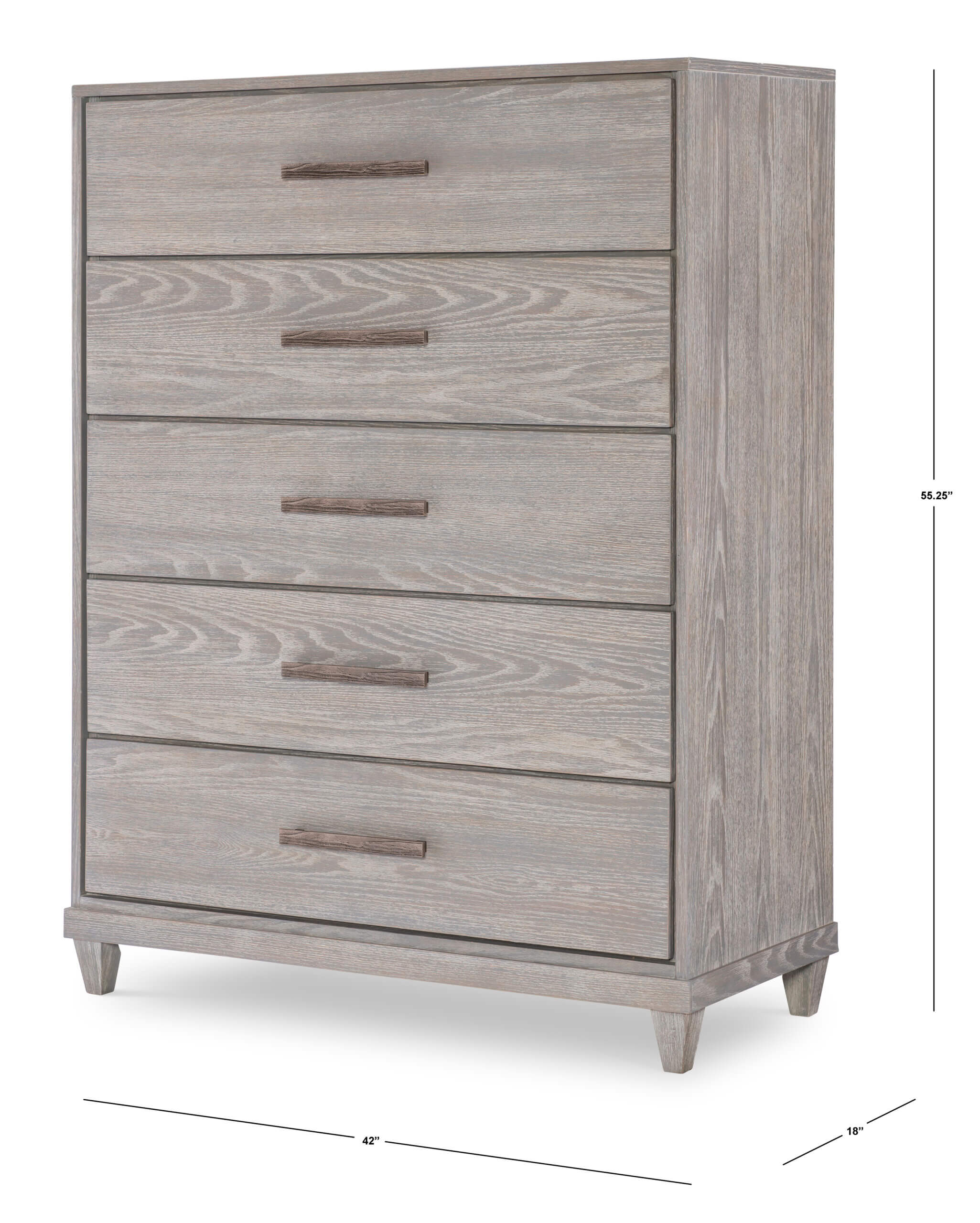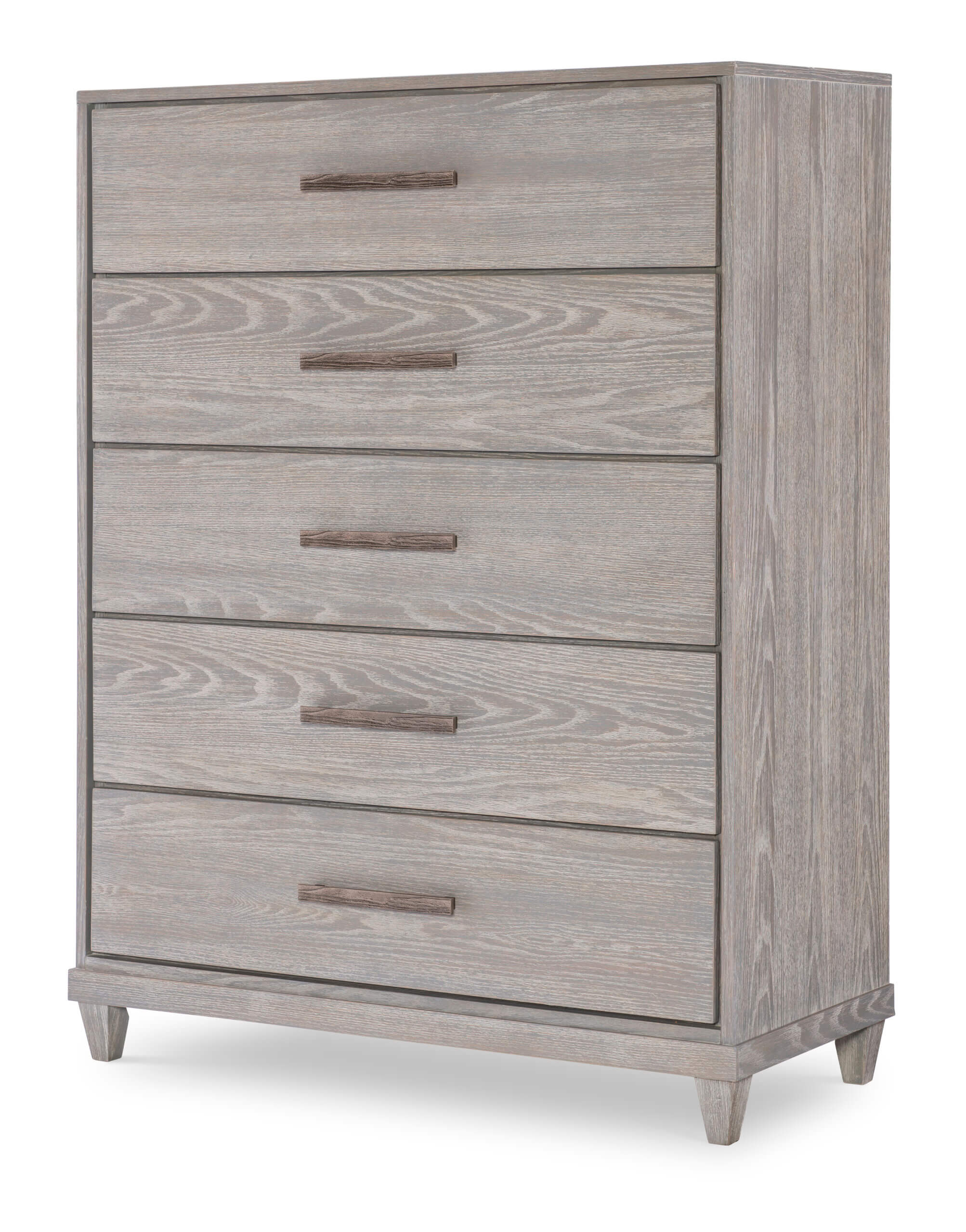 Modern forms combine with an aged, organic finish that creates a relaxed and updated take on the coastal inspired Artesia collection. Clean lines, soft shaping, flat front drawer fronts, tapered legs all resonate an elegant simplicity. The unique blending of elements allows Artesia to fit in numerous design themes and homes. The texturized Aged Sterling hardware gives a tactile element that balances perfectly with the rustic tone of the Smokey Taupe finish on Oak veneers.