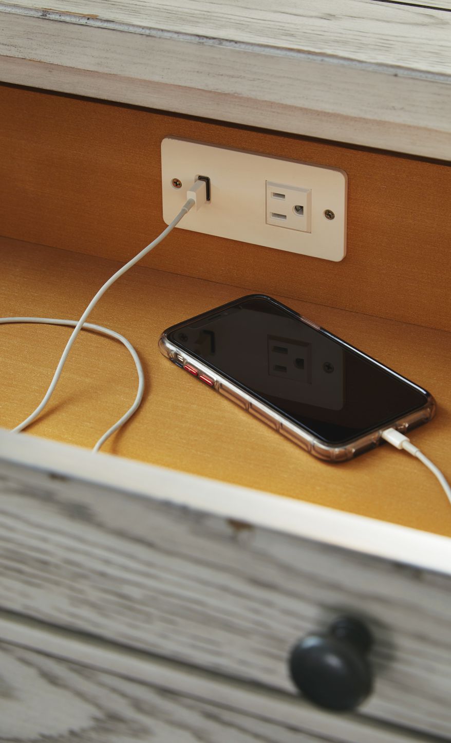 - 3 Drawers, Outlet w/USB in Top Drawer.