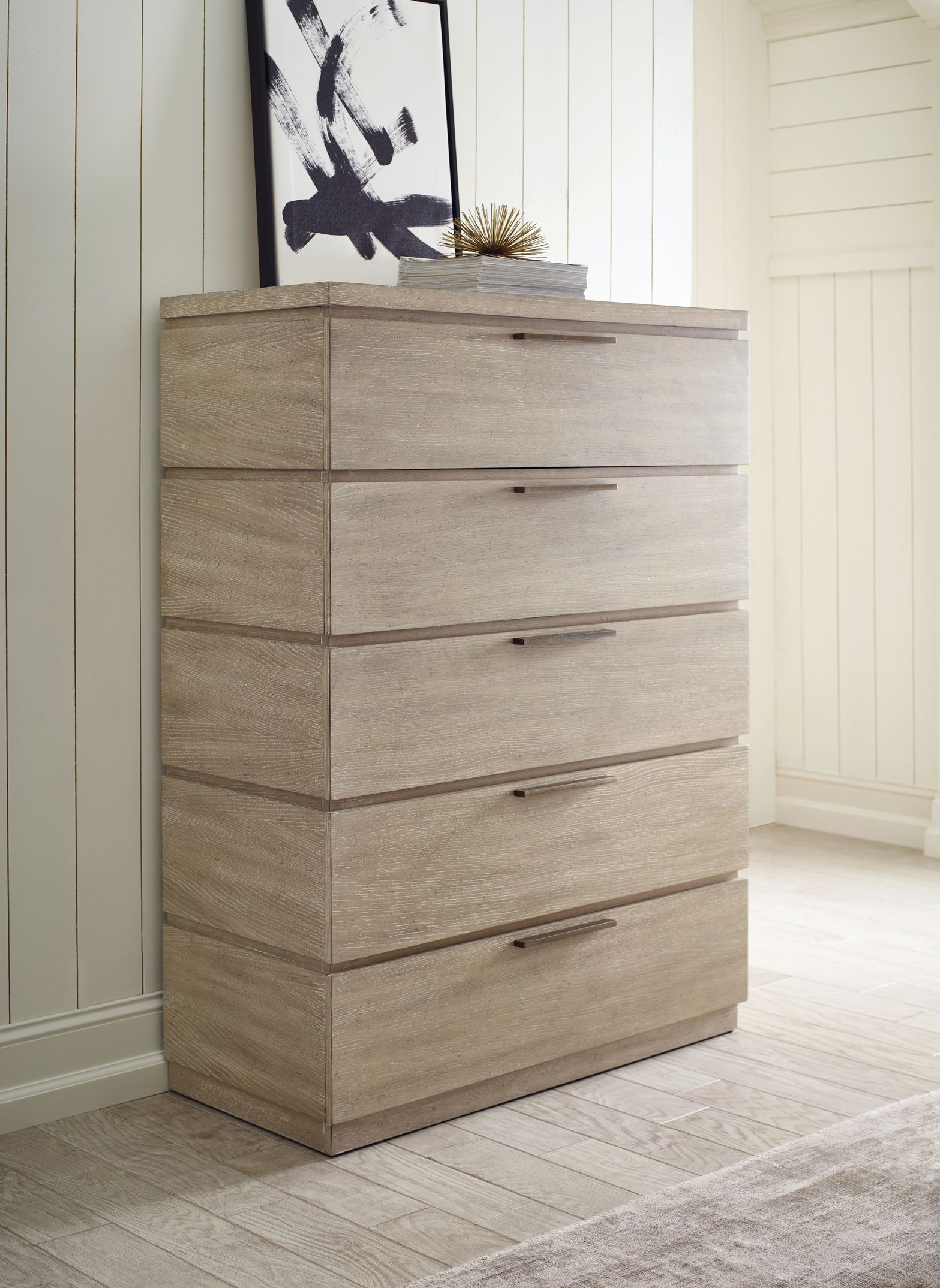 with Quartered White Oak Veneers, in a beautiful Sandstone finish, and accented with Modern Bronze