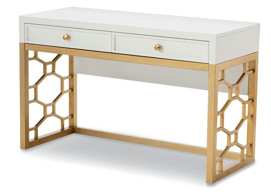 The clean, transitional lines of the white finish are offset with gold accents and Soft Gold Finish Knob hardware, making each piece as warm and inviting as it is stylish.
