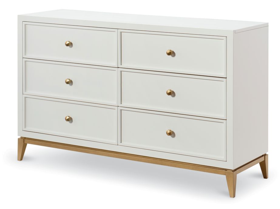 The clean, transitional lines of the white finish are offset with gold accents and Soft Gold Finish Knob hardware, making each piece as warm and inviting as it is stylish.