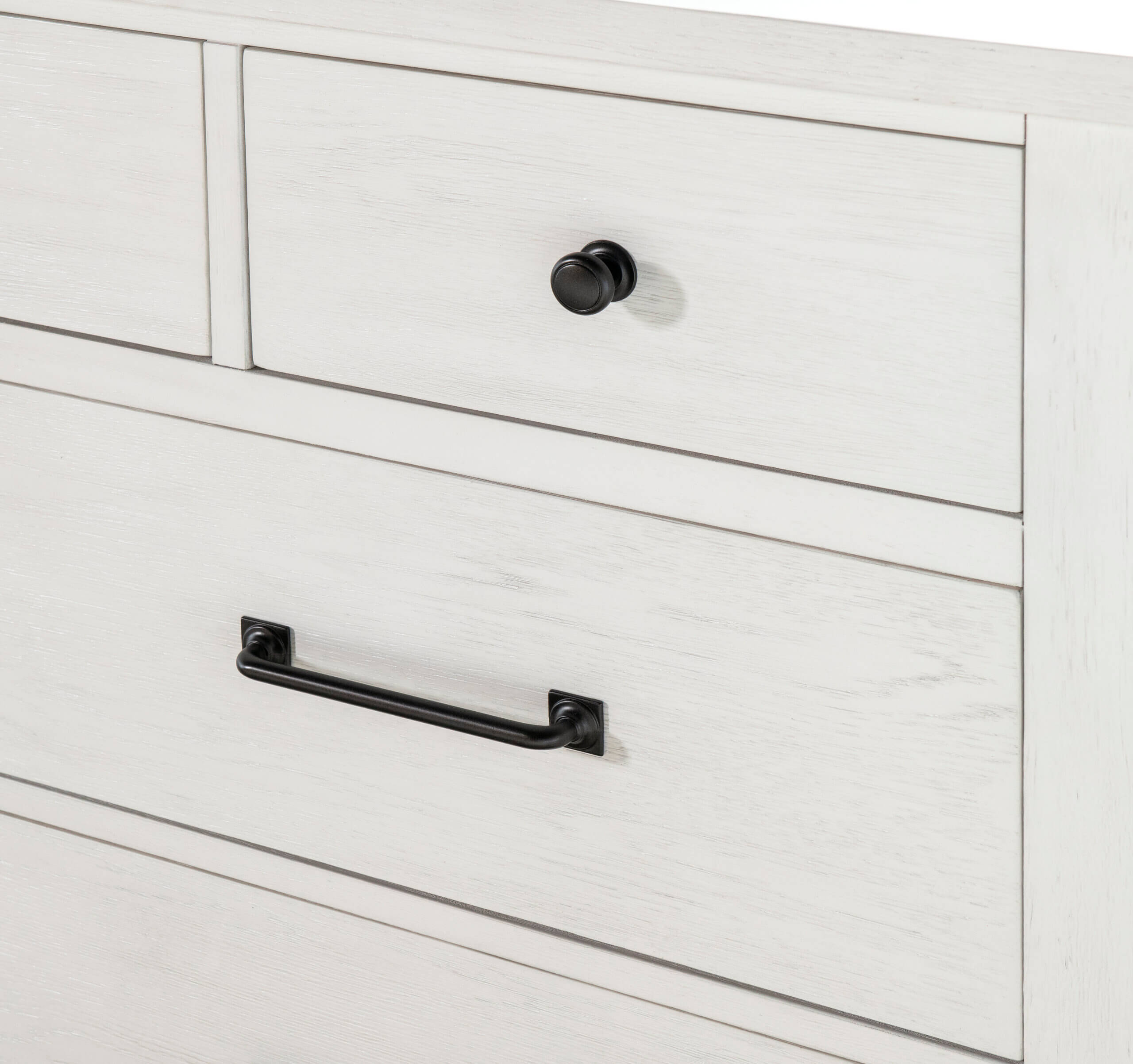 Modern farmhouse designs such as block feet, flat drawer fronts, and X motifs on side panels offer a lot of details without feeling cluttered. The natural variations of the grain and Aged White finish offer a casual, livable style. Simple Rustic Black finished bar pull and knob hardware completes each piece.