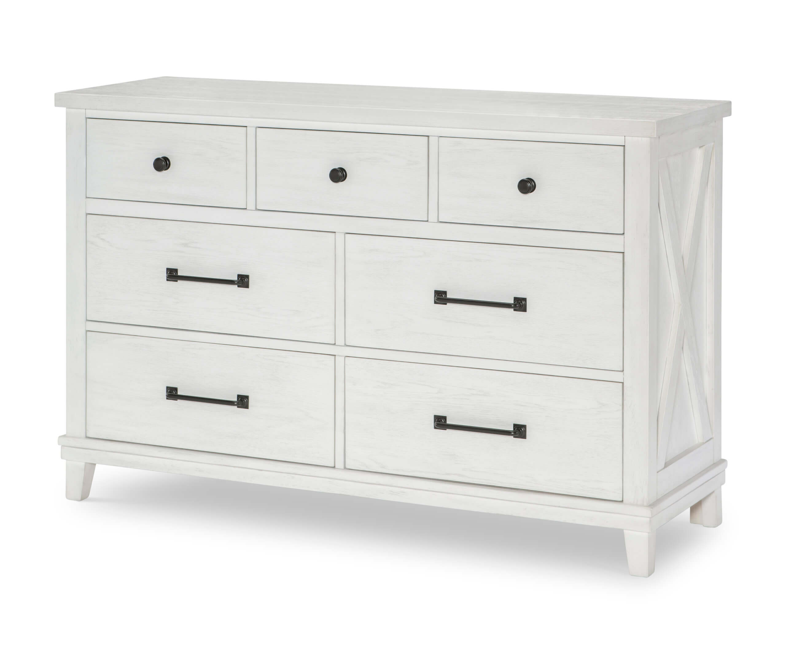 Modern farmhouse designs such as block feet, flat drawer fronts, and X motifs on side panels offer a lot of details without feeling cluttered. The natural variations of the grain and Aged White finish offer a casual, livable style. Simple Rustic Black finished bar pull and knob hardware completes each piece.