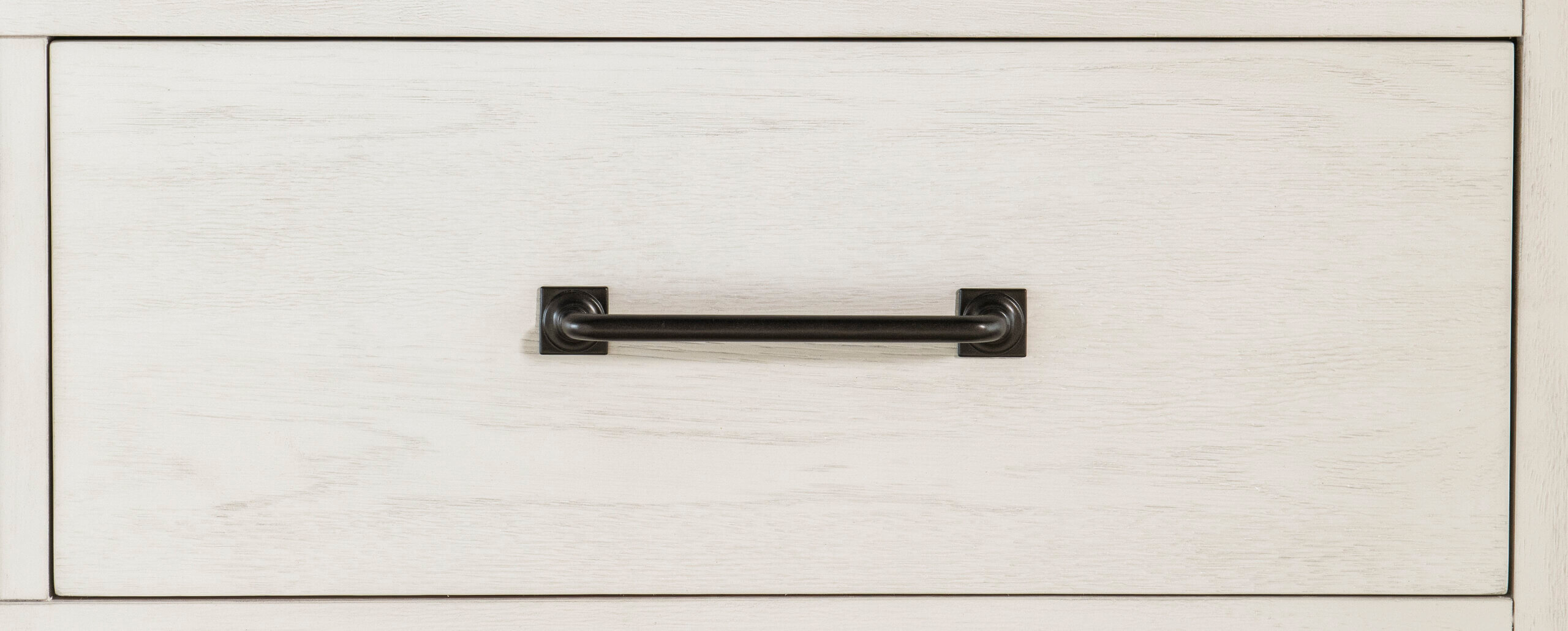 Modern farmhouse designs such as block feet, flat drawer fronts, and X motifs on side panels offer a lot of details without feeling cluttered. The natural variations of the grain and Aged White finish offer a casual, livable style. Simple Rustic Black finished bar pull and knob hardware completes each piece.