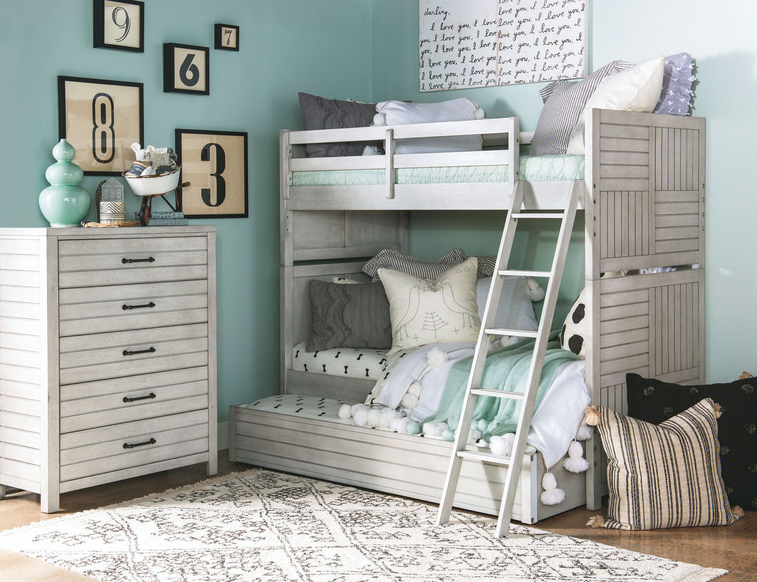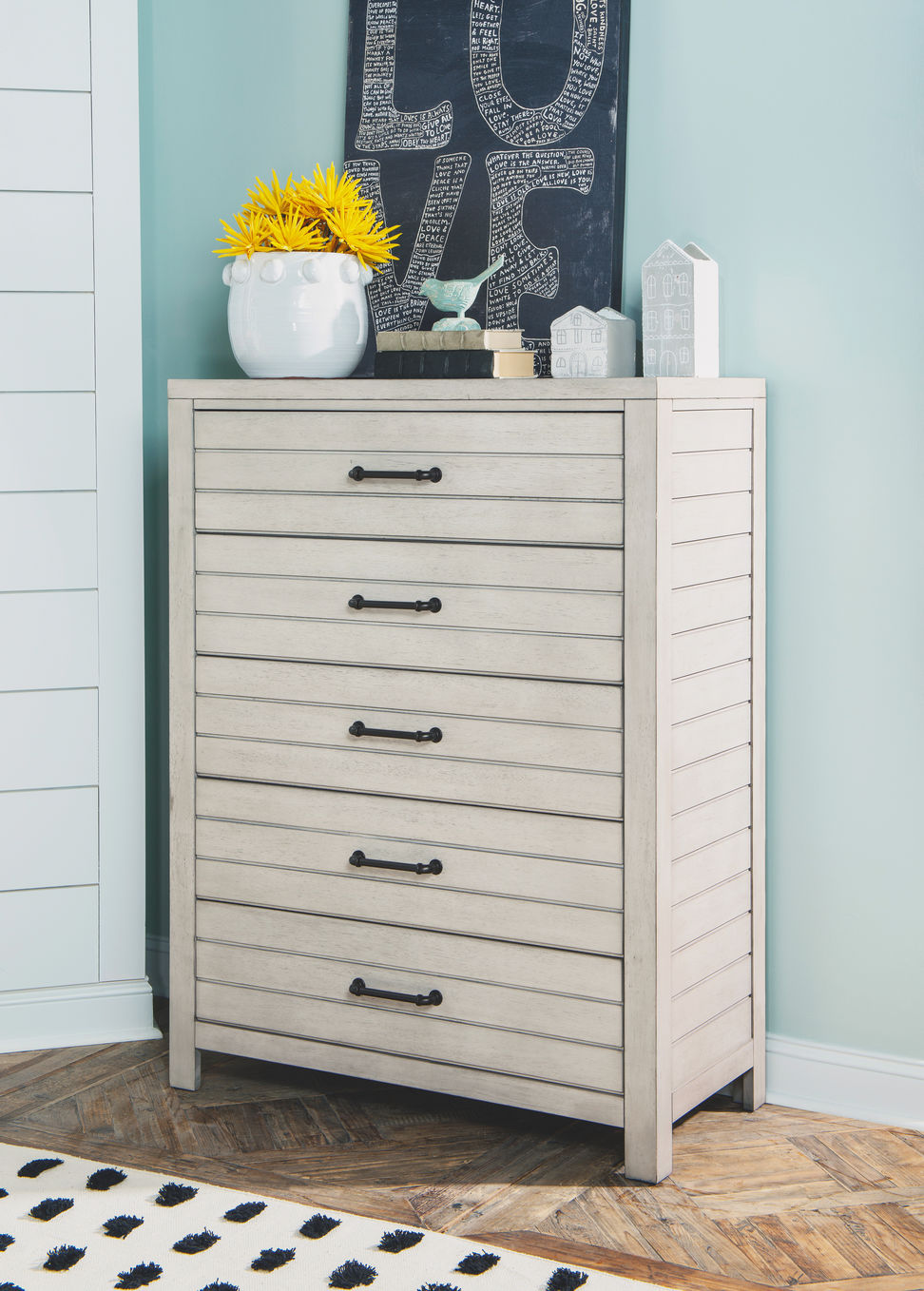 Features such as motion activated lights on nightstands; built-in outlets/USB chargers and creative storage options add function to this collection. Crafted of Select Hardwood Solids and Acacia Veneer in a lightly distressed, Stone Path White finish with Dark Iron bar pull hardware.