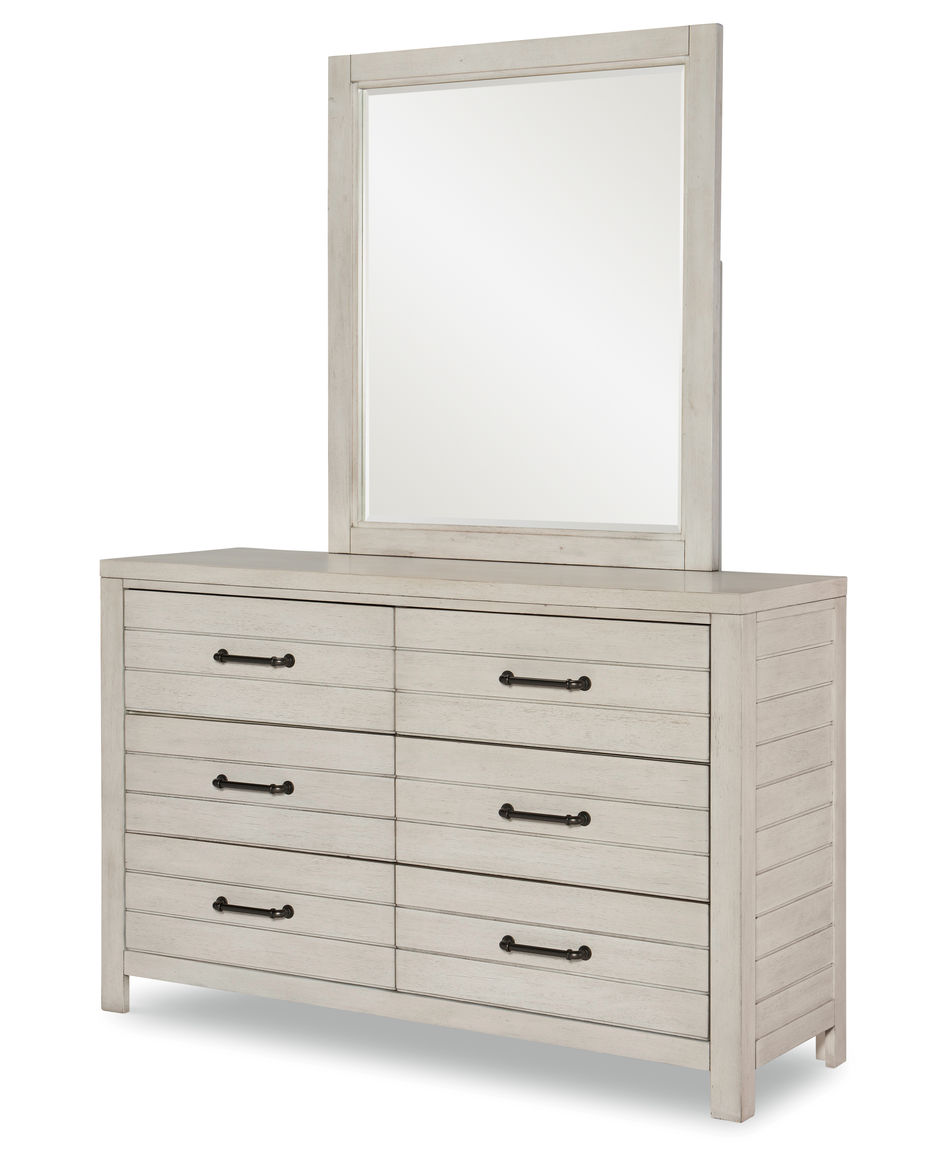 Features such as motion activated lights on nightstands; built-in outlets/USB chargers and creative storage options add function to this collection. Crafted of Select Hardwood Solids and Acacia Veneer in a lightly distressed, Stone Path White finish with Dark Iron bar pull hardware.