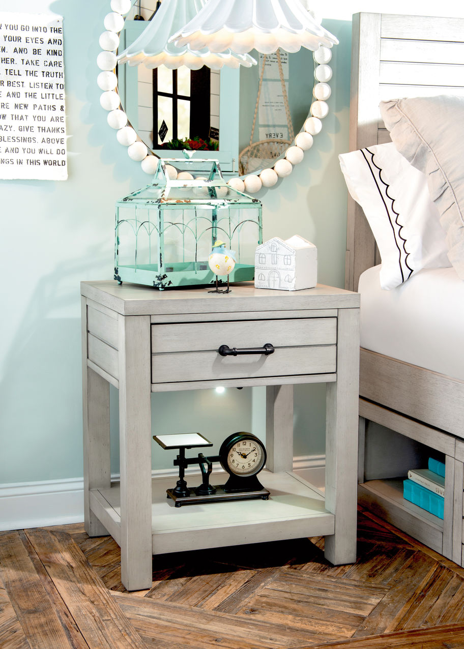 Features such as motion activated lights on nightstands; built-in outlets/USB chargers and creative storage options add function to this collection. Crafted of Select Hardwood Solids and Acacia Veneer in a lightly distressed, Stone Path White finish with Dark Iron bar pull hardware.