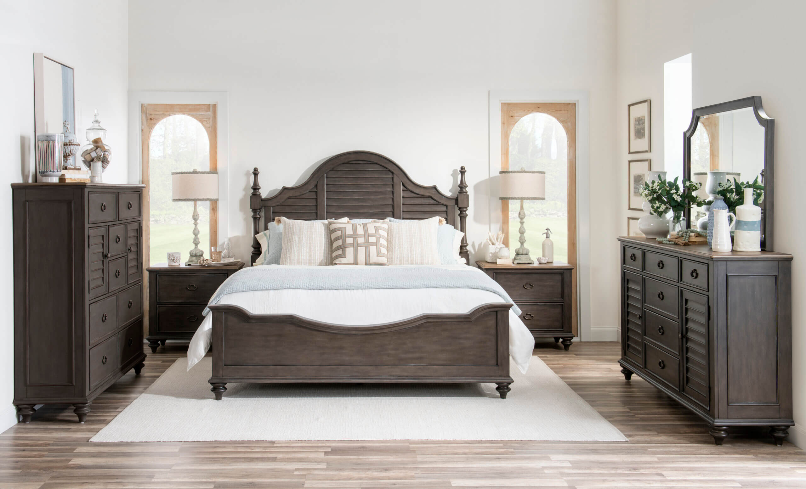 Kingston is a casual traditional, cottage-inspired whole home furniture collection offering an upscale two-tone finish combination of Dark Sable with Sandalwood tops, creating an elevated look for the classic style aesthetic. Either finish combination is available on each of the 25 pieces in the collection. Featuring a relaxed, distressed finish, Kingston fits a variety of decorating themes ranging from farmhouse to traditional, and even coastal or mountain homes. Several of the pieces have louvered fronts, including the headboard on the low-post bed, a dresser, dressing chest, executive desk, and an entertainment center.
