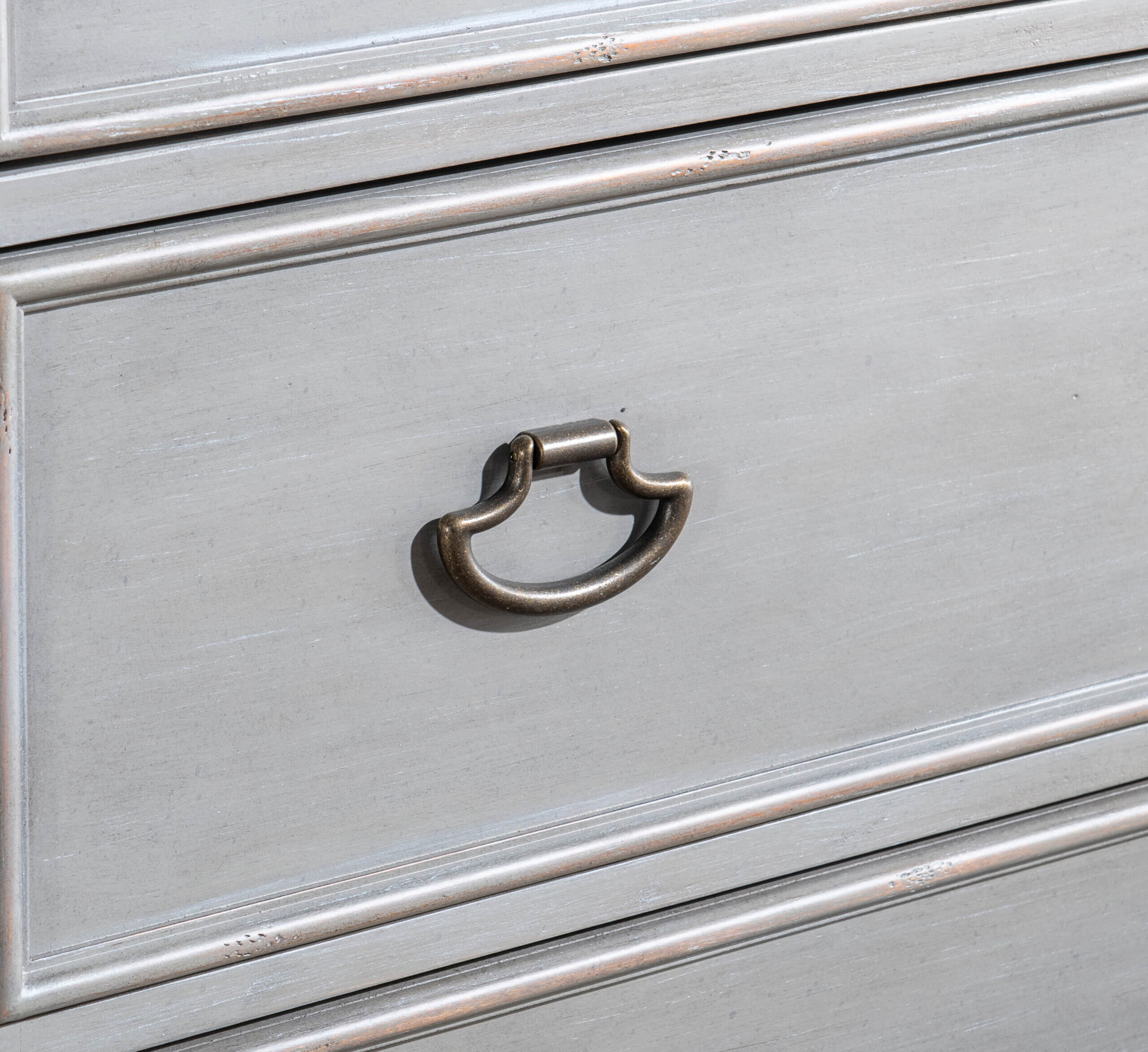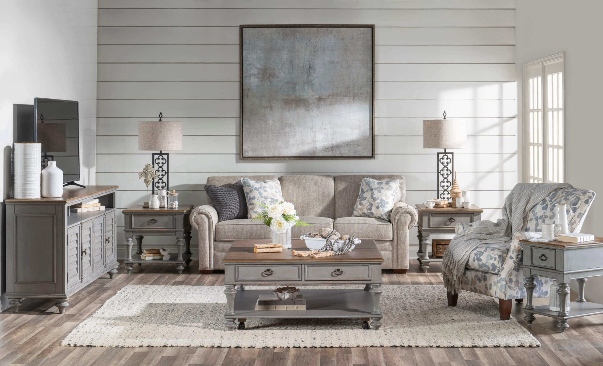 Kingston is a casual traditional, cottage-inspired whole home furniture collection offering an upscale two-tone finish combination of Tweed Gray with Sandalwood tops, creating an elevated look for the classic style aesthetic. Either finish combination is available on each of the 25 pieces in the collection. Featuring a relaxed, distressed finish, Kingston fits a variety of decorating themes ranging from farmhouse to traditional, and even coastal or mountain homes. Several of the pieces have louvered fronts, including the headboard on the low-post bed, a dresser, dressing chest, executive desk, and an entertainment center.