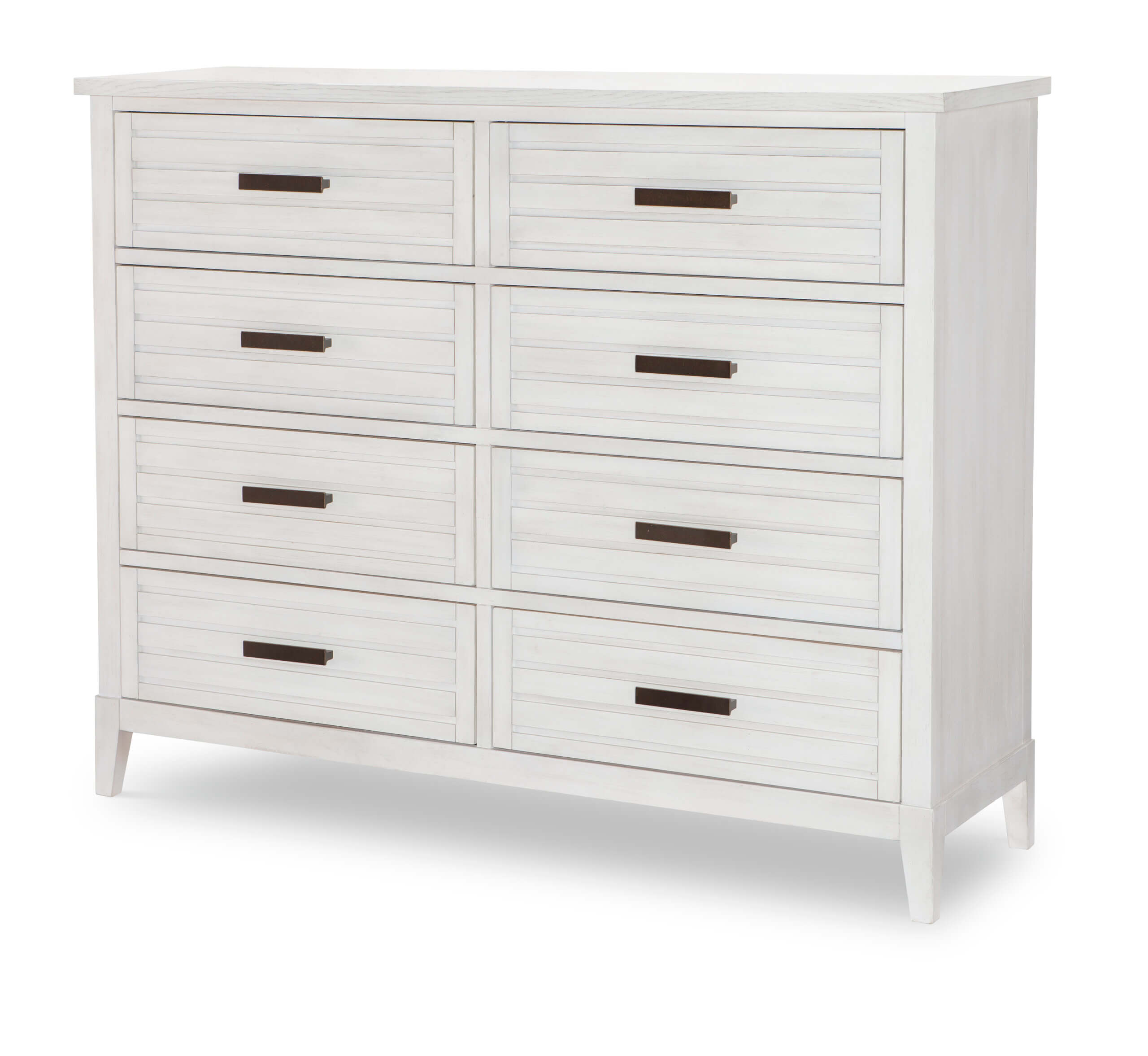 Details such as canted legs, a shutter motif on drawer fronts and bases, along with the Aged Bronze hardware, lend the perfect amount of a relaxed and livable vibe.