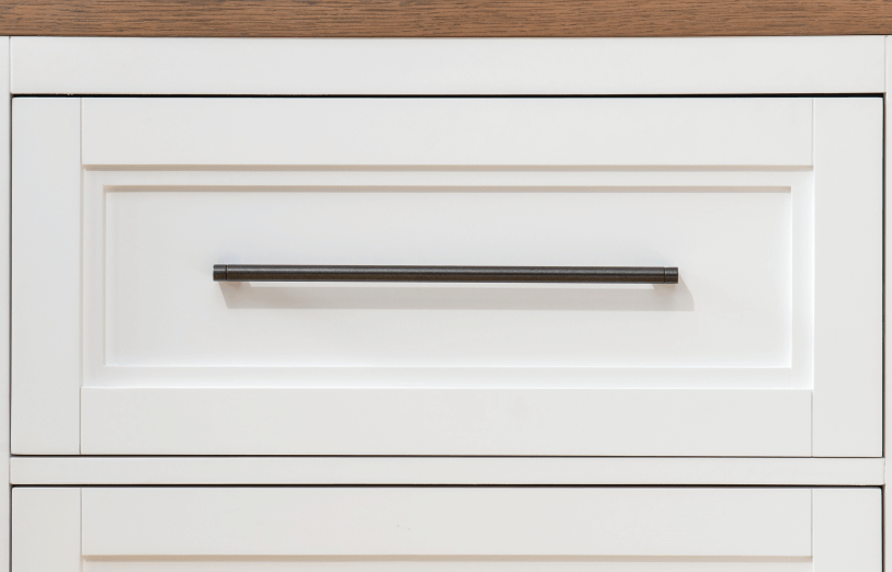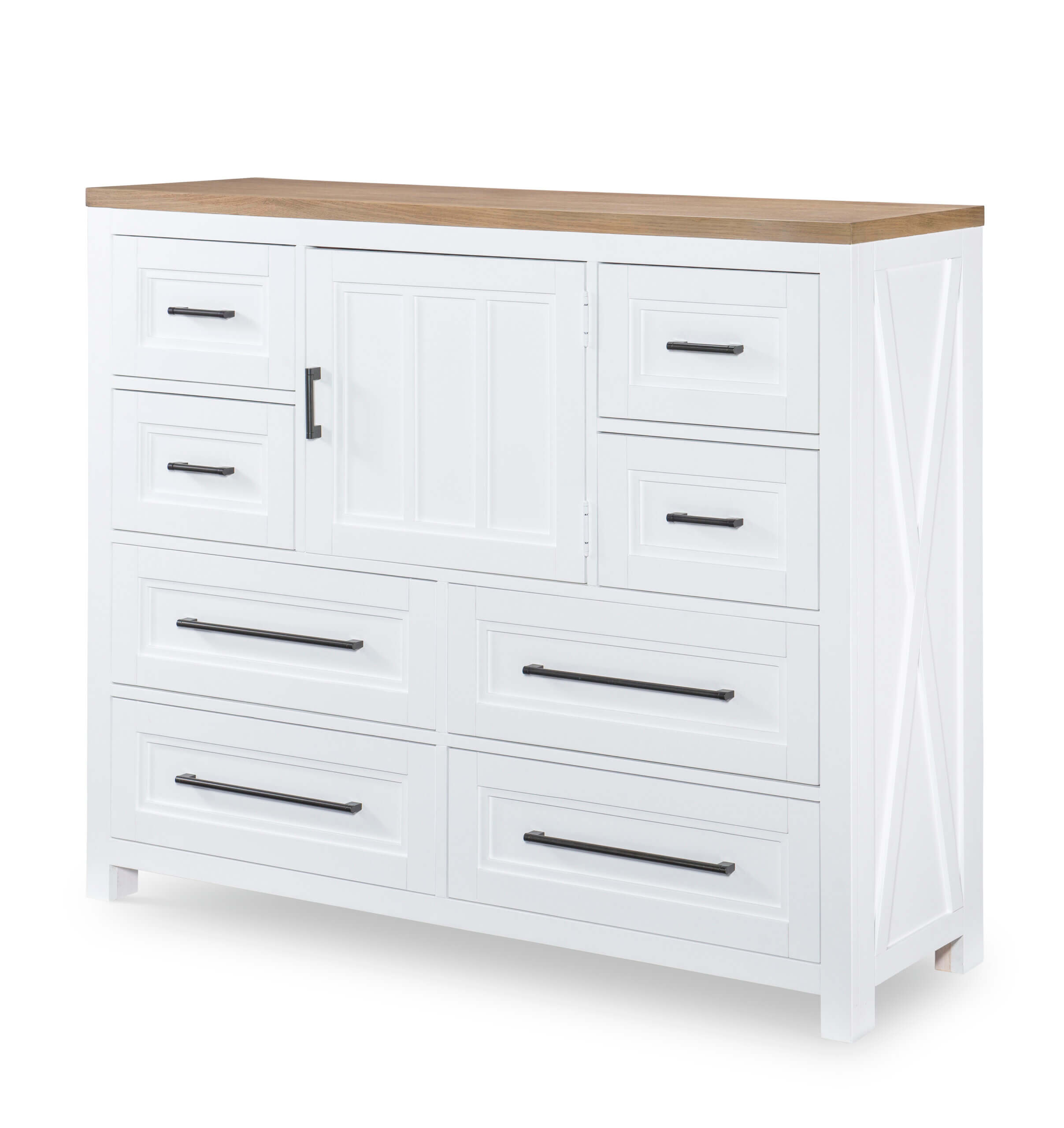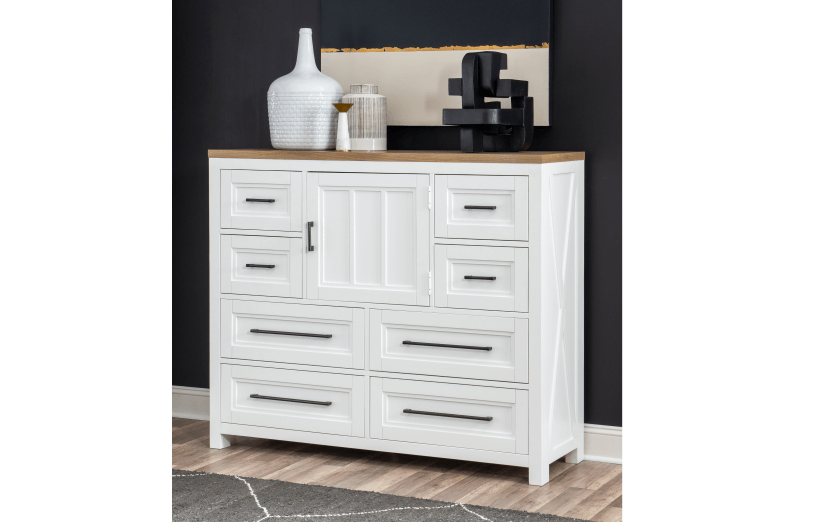 Simple farmhouse details such as block feet, beveled framed drawer fronts, planking and X motifs create visual interest in a modern way and without feeling too cluttered. Harvest Oak tops on quartered white oak veneer sit atop Natural White painted bases. Select items offered in Aged Black that repeats the finish on hardware and accents.