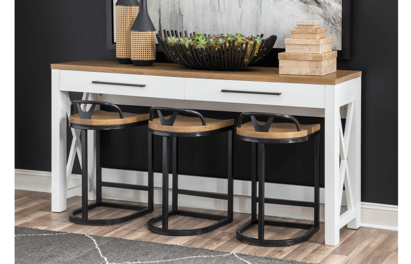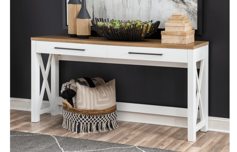 Simple farmhouse details such as block feet, beveled framed drawer fronts, planking and X motifs create visual interest in a modern way and without feeling too cluttered. Harvest Oak tops on quartered white oak veneer sit atop Natural White painted bases. Select items offered in Aged Black that repeats the finish on hardware and accents.