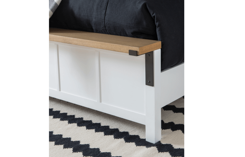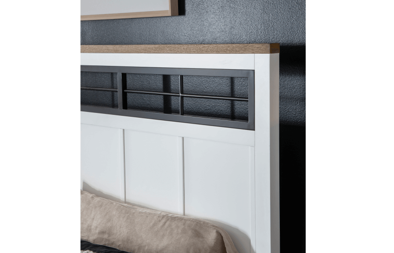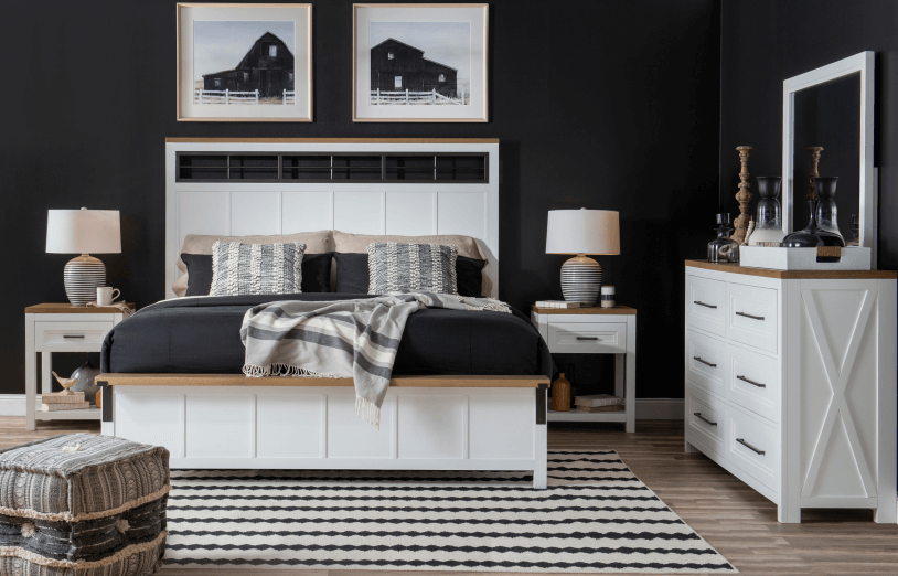 Simple farmhouse details such as block feet, beveled framed drawer fronts, planking and X motifs create visual interest in a modern way and without feeling too cluttered. Harvest Oak tops on quartered white oak veneer sit atop Natural White painted bases. Select items offered in Aged Black that repeats the finish on hardware and accents.