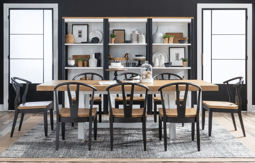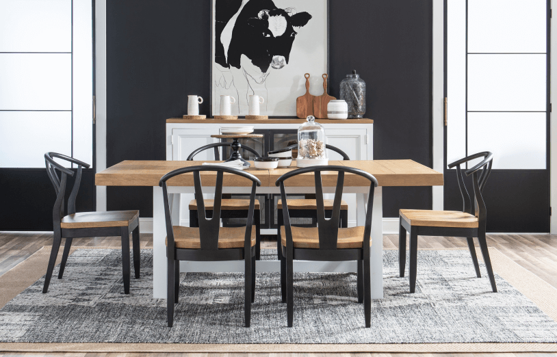 Simple farmhouse details such as block feet, beveled framed drawer fronts, planking and X motifs create visual interest in a modern way and without feeling too cluttered. Harvest Oak tops on quartered white oak veneer sit atop Natural White painted bases. Select items offered in Aged Black that repeats the finish on hardware and accents.