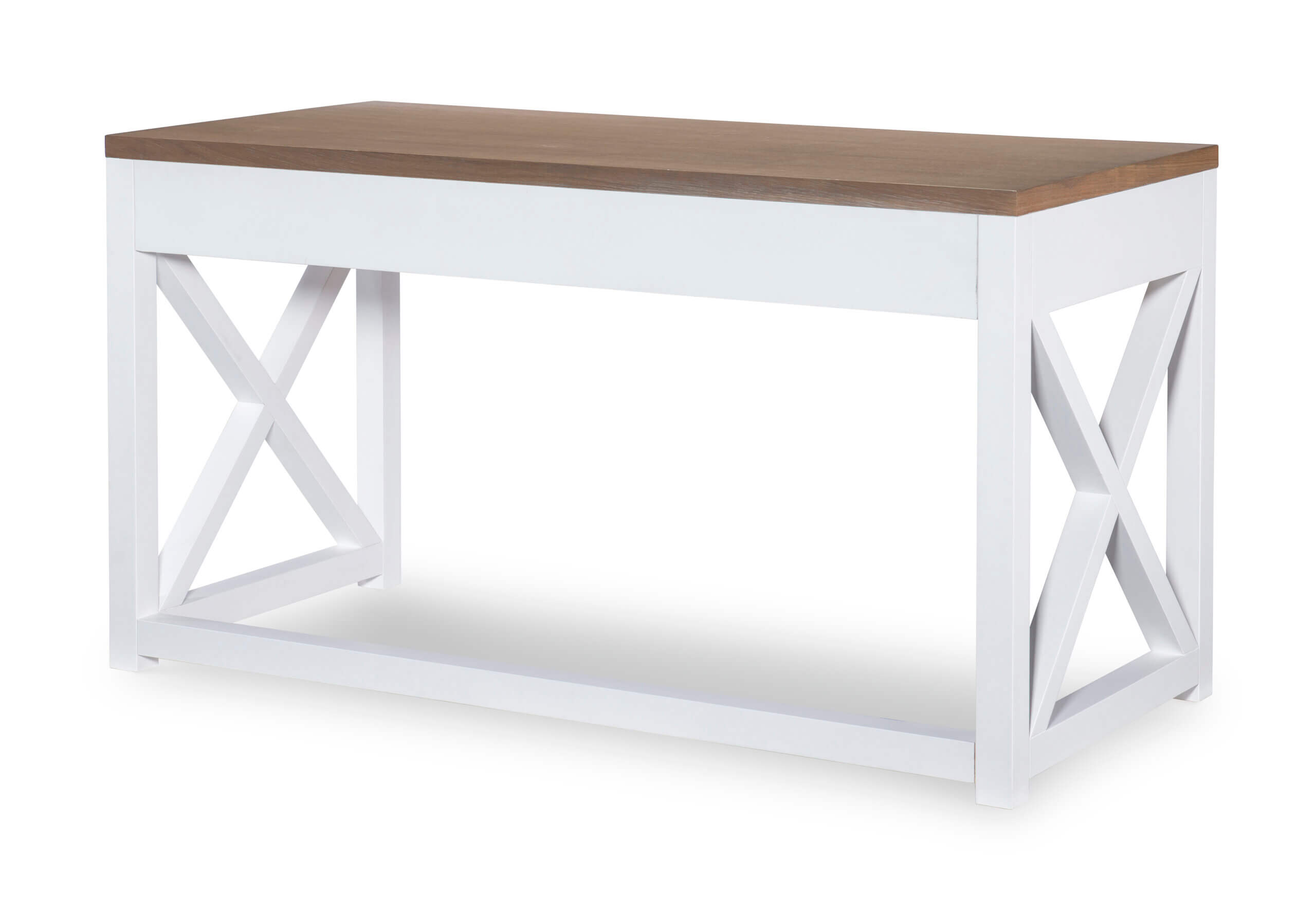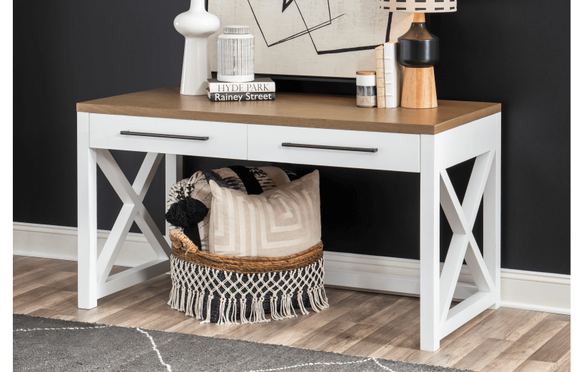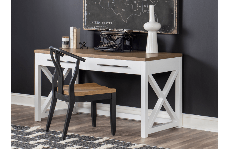 Simple farmhouse details such as block feet, beveled framed drawer fronts, planking and X motifs create visual interest in a modern way and without feeling too cluttered. Harvest Oak tops on quartered white oak veneer sit atop Natural White painted bases. Select items offered in Aged Black that repeats the finish on hardware and accents.