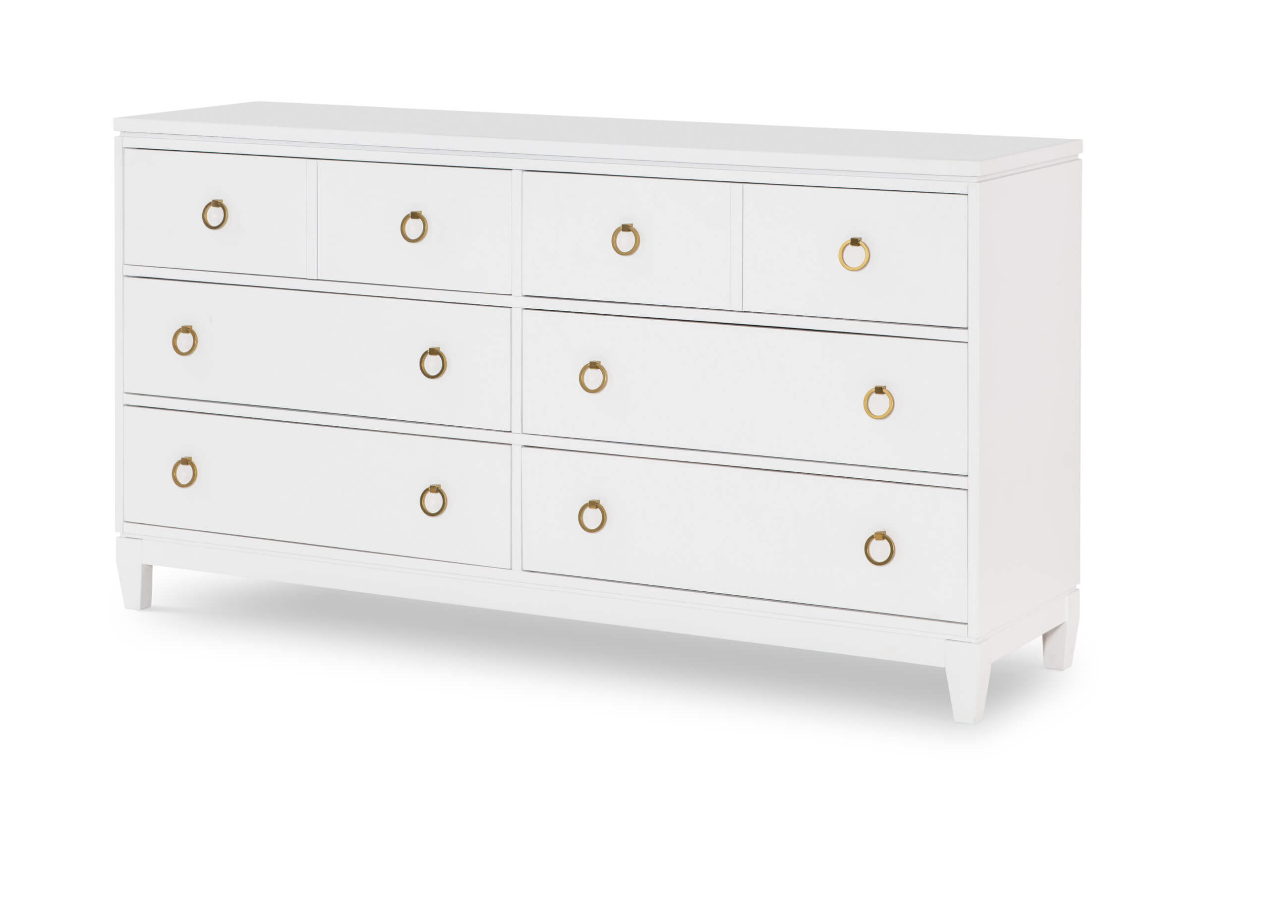 Elements such as floating tops, tapered feet, flat drawer fronts, and simple shapes lend the perfect backdrop for easily creating a beautifully styled space. The pieces and scale of Summerland allows multiple options for a modern, livable style. Gold ring pulls hardware adds a high-end touch.