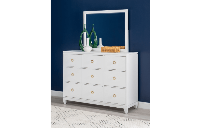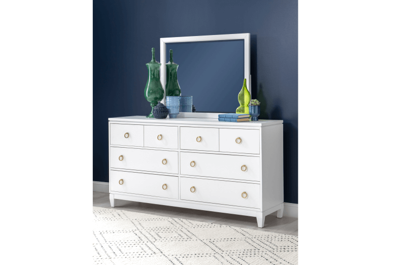 Elements such as floating tops, tapered feet, flat drawer fronts, and simple shapes lend the perfect backdrop for easily creating a beautifully styled space. The pieces and scale of Summerland allows multiple options for a modern, livable style. Gold ring pulls hardware adds a high-end touch.
