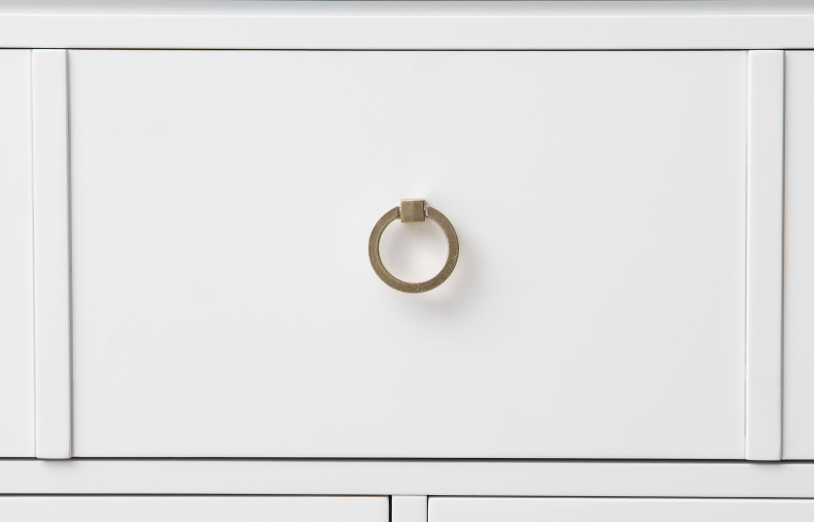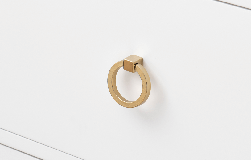 Elements such as floating tops, tapered feet, flat drawer fronts, and simple shapes lend the perfect backdrop for easily creating a beautifully styled space. The pieces and scale of Summerland allows multiple options for a modern, livable style. Gold ring pulls hardware adds a high-end touch.