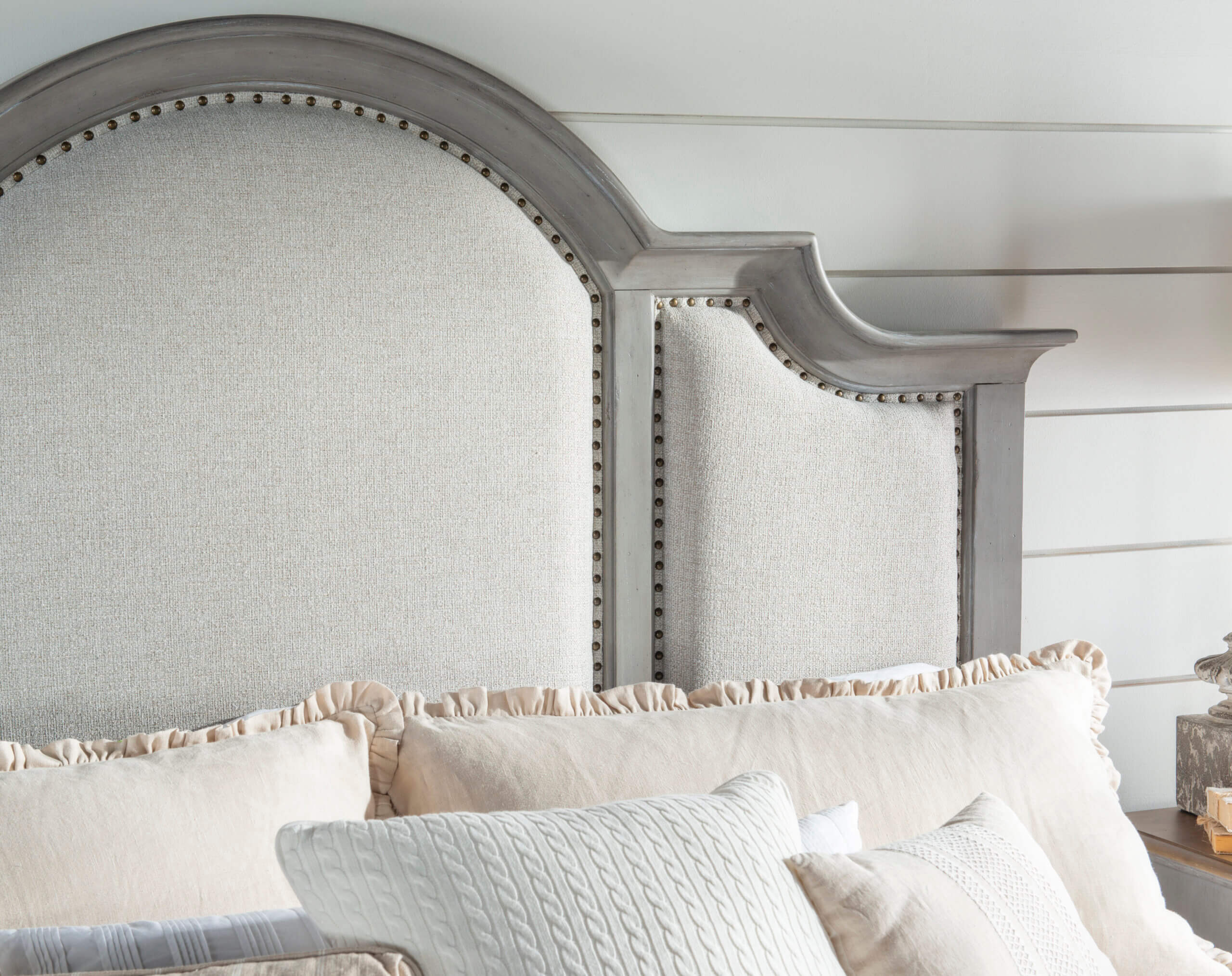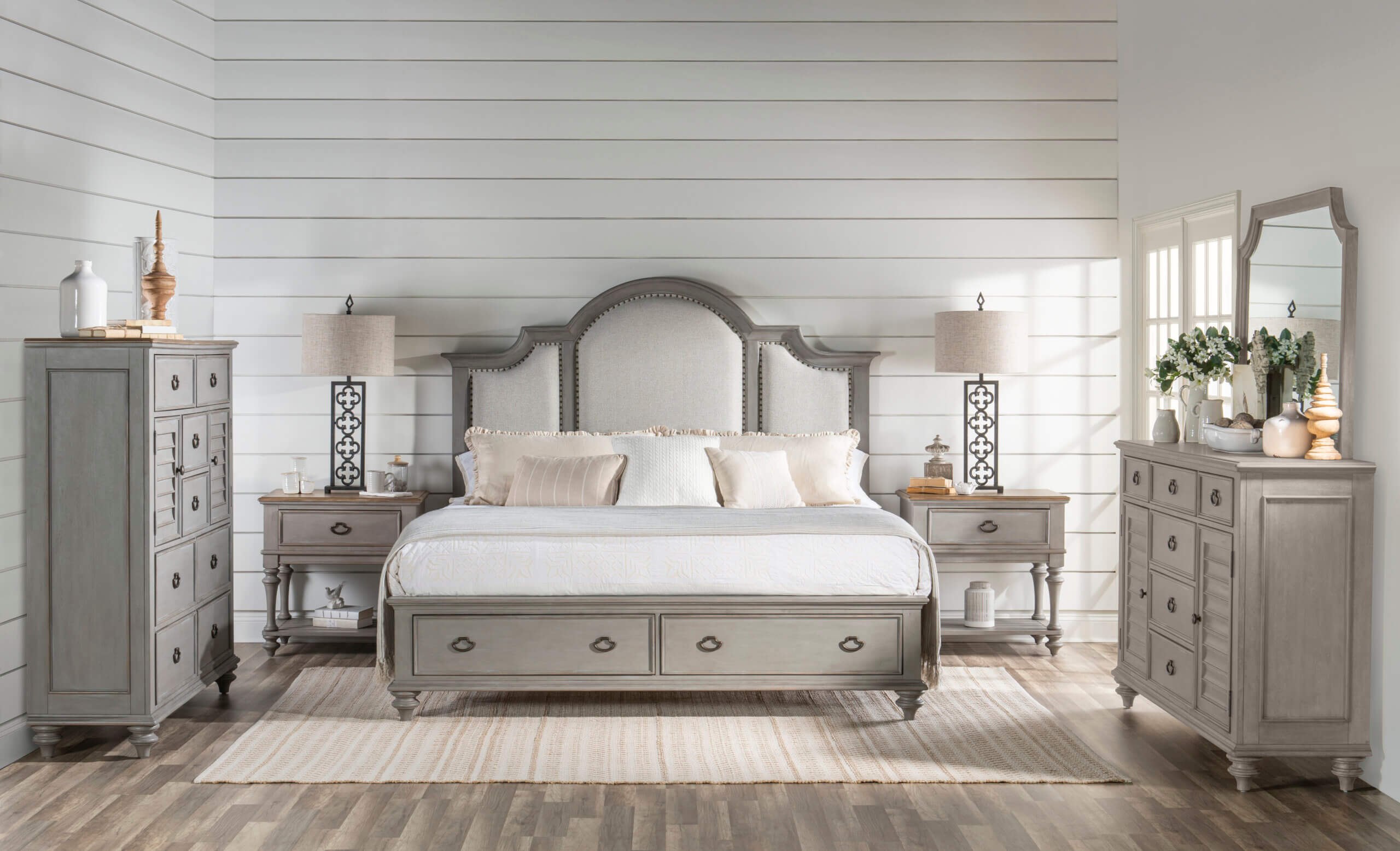 Kingston is a casual traditional, cottage-inspired whole home furniture collection offering an upscale two-tone finish combination of Tweed Gray with Sandalwood tops, creating an elevated look for the classic style aesthetic. Either finish combination is available on each of the 25 pieces in the collection. Featuring a relaxed, distressed finish, Kingston fits a variety of decorating themes ranging from farmhouse to traditional, and even coastal or mountain homes. Several of the pieces have louvered fronts, including the headboard on the low-post bed, a dresser, dressing chest, executive desk, and an entertainment center.