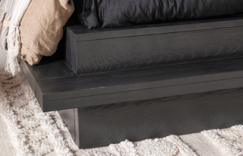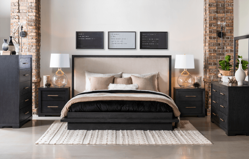 Minimalist design details such as block feet, flat drawer fronts, and geometric shapes lend the perfect backdrop for the distinctive wire brushed finish. The scale of Westwood forms a modern statement, while the natural variations of the grain and rich Charred Oak hues offer a casual, livable style. Simple Antique Gold finished bar pull hardware adds subtle intrigue to this bedroom and dining collection.