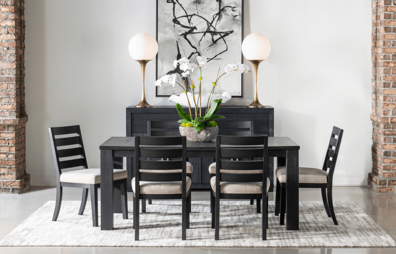 Minimalist design details such as block feet, flat drawer fronts, and geometric shapes lend the perfect backdrop for the distinctive wire brushed finish. The scale of Westwood forms a modern statement, while the natural variations of the grain and rich Charred Oak hues offer a casual, livable style. Simple Antique Gold finished bar pull hardware adds subtle intrigue to this bedroom and dining collection.