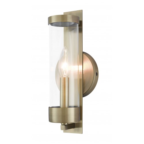 A glass cylinder shines with light as the antique brass straps and back plate ground this sconce with a modern style. This wall sconce will add a clean sleek look to any room.