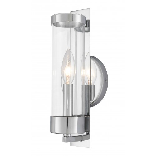 A glass cylinder shines with light as the polished chrome straps and back plate ground this sconce with a modern style. This wall sconce will add a clean sleek look to any room.