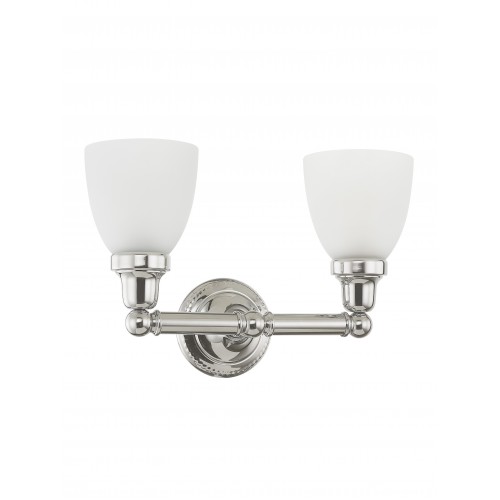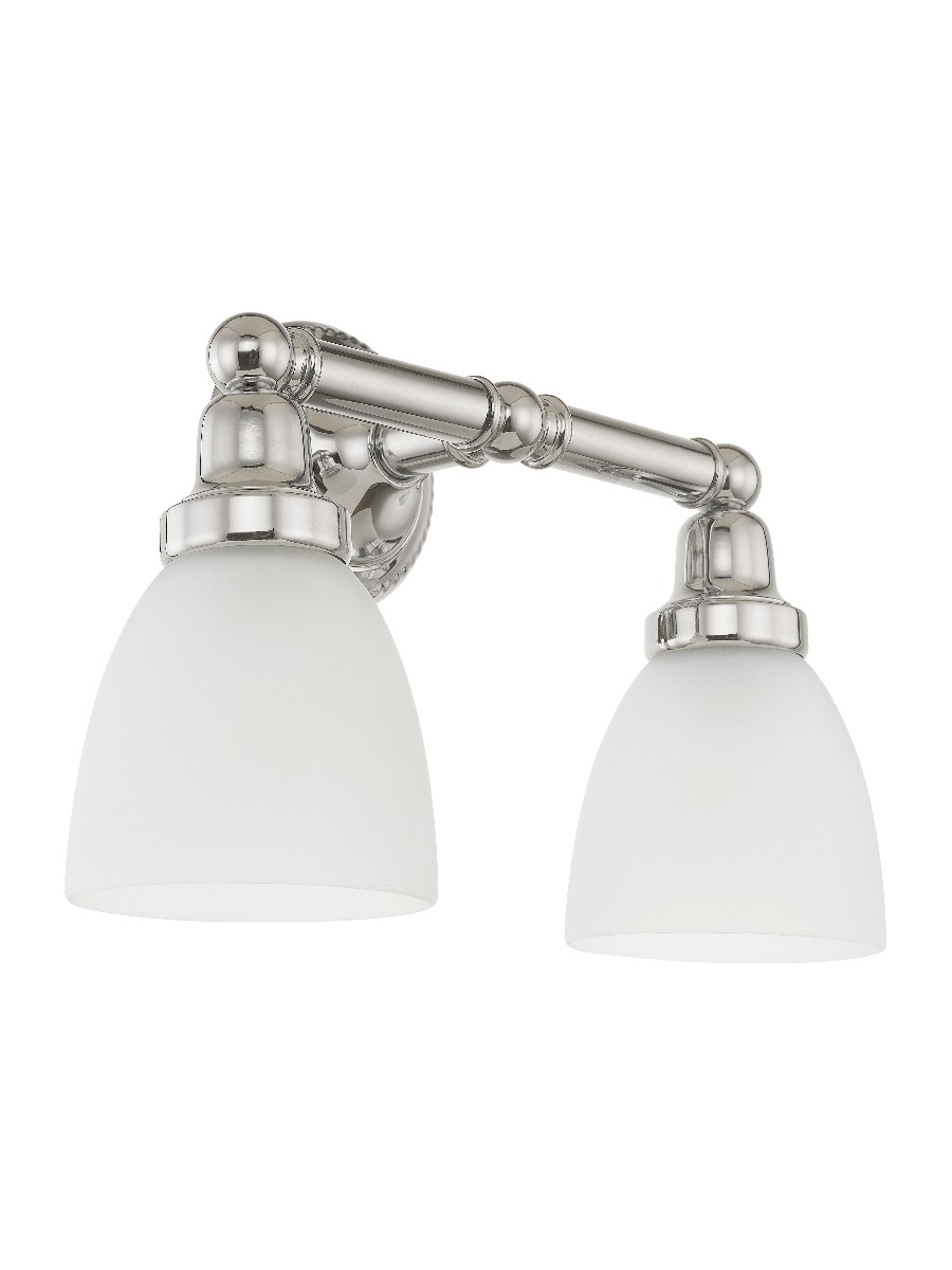 In a polished chrome finish, this two light bath fixture features a timeless torchiere design. Topped with Satin Opal White glass shades which provide a clean and classic look that will complete any space. This fixture is the perfect finishing touch to your bathroom!