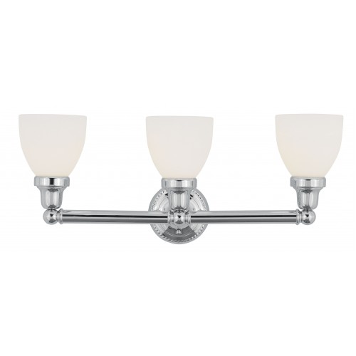 In a polished chrome finish, this three light bath fixture features a timeless torchiere design. Topped with Satin Opal White glass shades which provide a clean and classic look that will complete any space. This fixture is the perfect finishing touch to your bathroom!