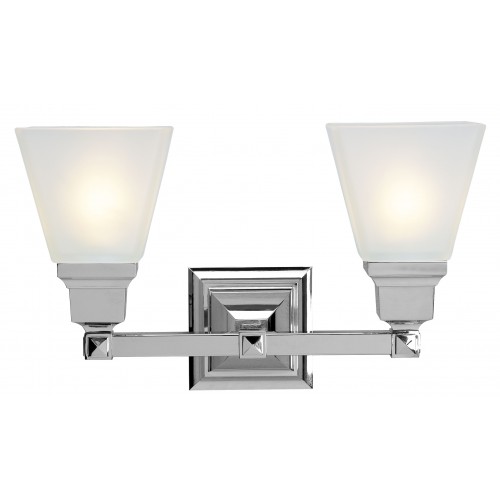 The Mission collection has clean lines with geometric forms. This two light bath fixture with etched opal glass is finished in polished chrome. Square bar style arms elevate the glass.
