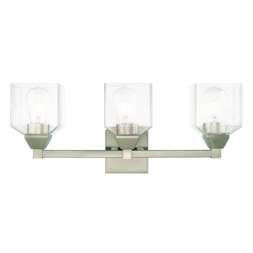 This bath vanity light is sure to provide reliable illumination without sacrificing style. It features three clear seeded glass shades with an open bottom, exposing the bulbs inside. A brushed nickel finish covers the backplate and accents the light.
