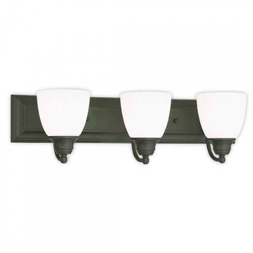 Bring a beautiful new look to your bathroom or vanity area with this charming three light bath fixture. A wide rectangular backplate in bronze finish supports three simple arms that hold three glass shades in hand blown satin opal white glass.