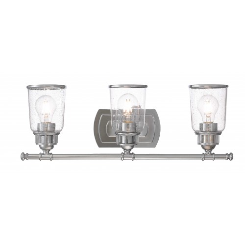 Our Lawrenceville collection features a retro industrial design, reminiscent of 19th century lighting. This three light bath vanity comes in a polished chrome finish and clear seeded glass.