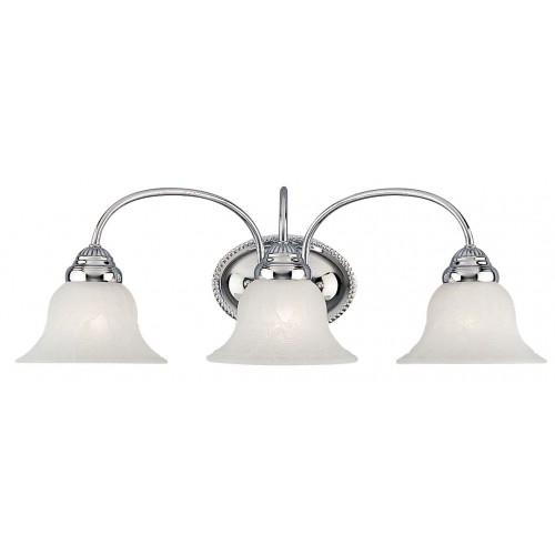 This three light bath vanity from the Edgemont collection is a fine and handsome fixture that features white alabaster glass. Edgemont is comprised of traditional iron forms in an polished chrome finish.