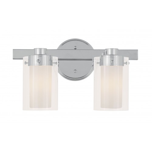 This transitional two light bathroom fixture will bring posh sophistication to your decor. The backplate and simple metal arms give this polished chrome finish a sleek, contemporary look. Opal etched glass surrounds each light, encased in clear glass cylinders for a stunning double-glass effect.