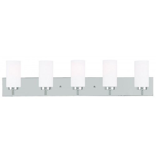 Tired of starting each day looking at the same, worn out bathroom lighting? Why not wake up to the polished chrome finish and hand blown satin opal white cylinder glass of this five light bathroom fixture?