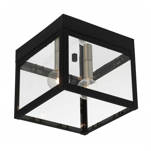 The dramatically simple shape and bold lines help define our Nyack ceiling mount. Featured in a black finish, this outdoor ceiling mount has panels of clear glass.
