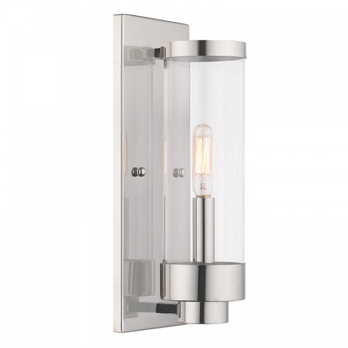 The one light outdoor wall lantern from the Hillcrest collection made of rugged stainless steel features a simple elegant polished chrome frame paired with closed top clear glass shade. The shade is accented with a banded polished chrome ring to carry through the theme of finely crafted metal fittings.