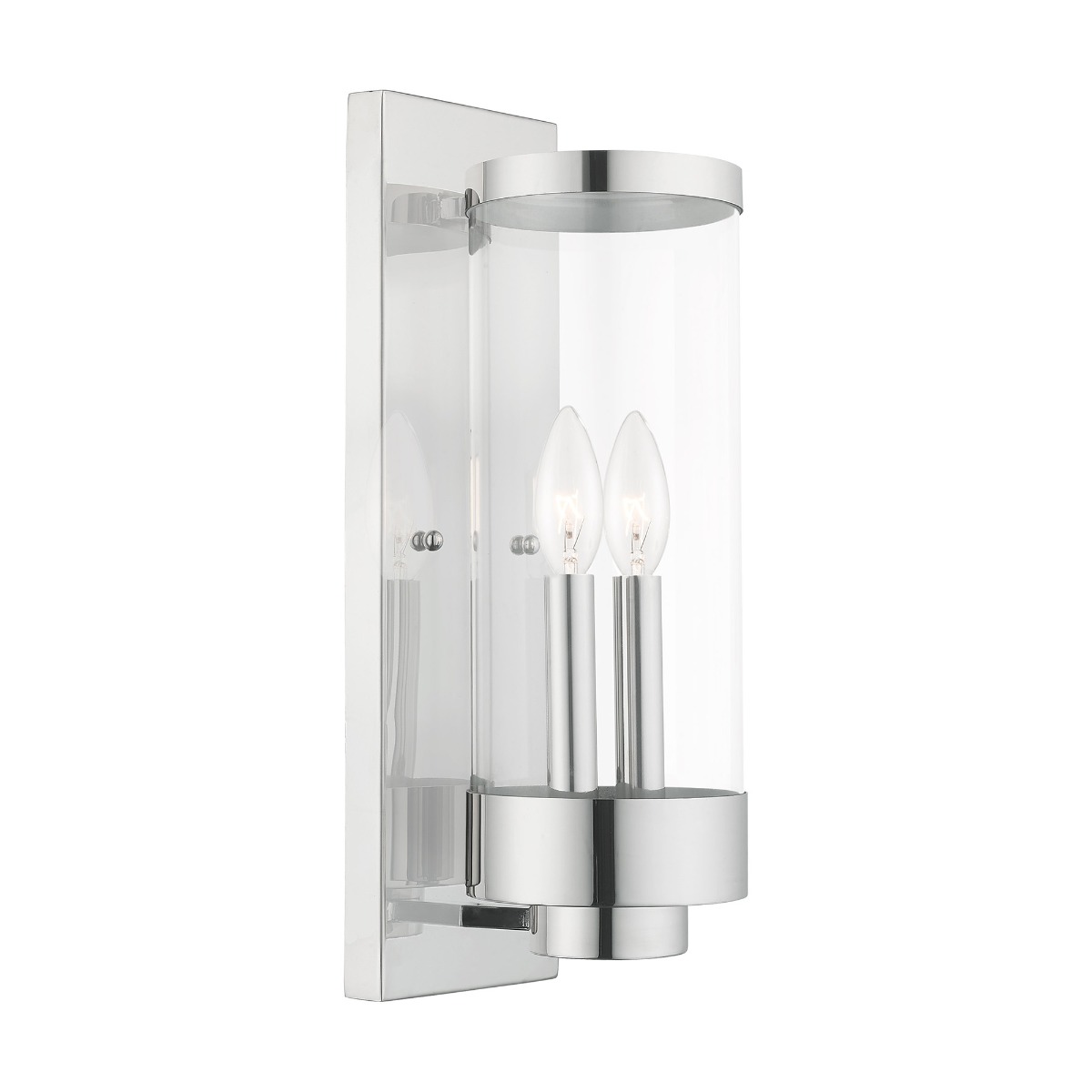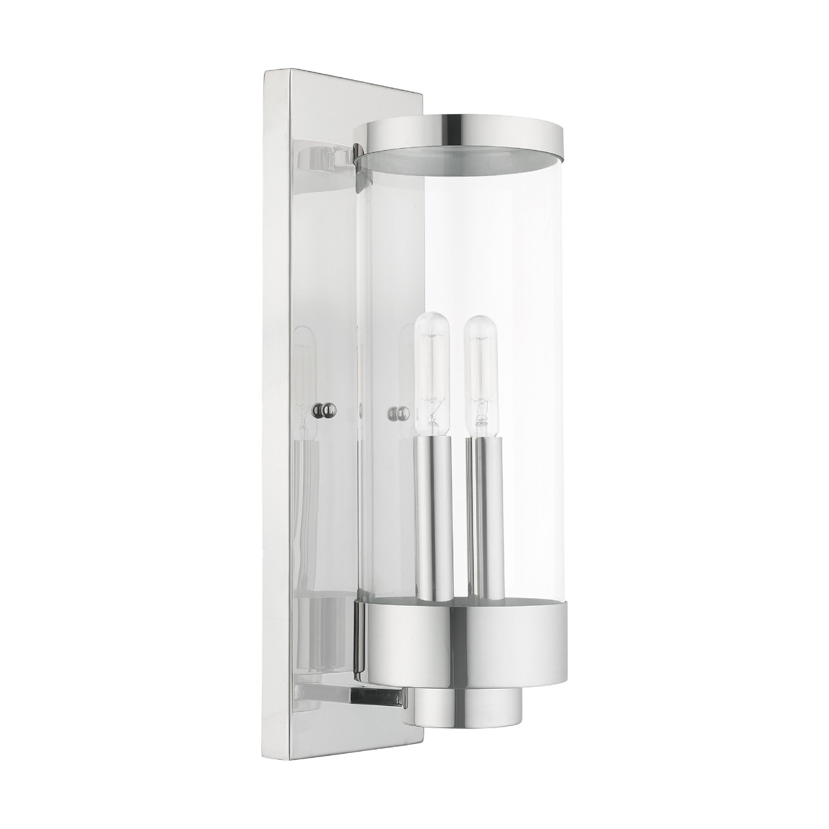 The two light outdoor wall lantern from the Hillcrest collection made of rugged stainless steel features a simple elegant polished chrome frame paired with closed top clear glass shade. The shade is accented with a banded polished chrome ring to carry through the theme of finely crafted metal fittings.