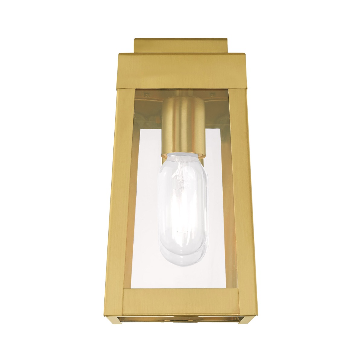 This updated industrial design comes in a tapering solid brass satin brass frame with a sleek, straight-lined look and features clear glass panels.