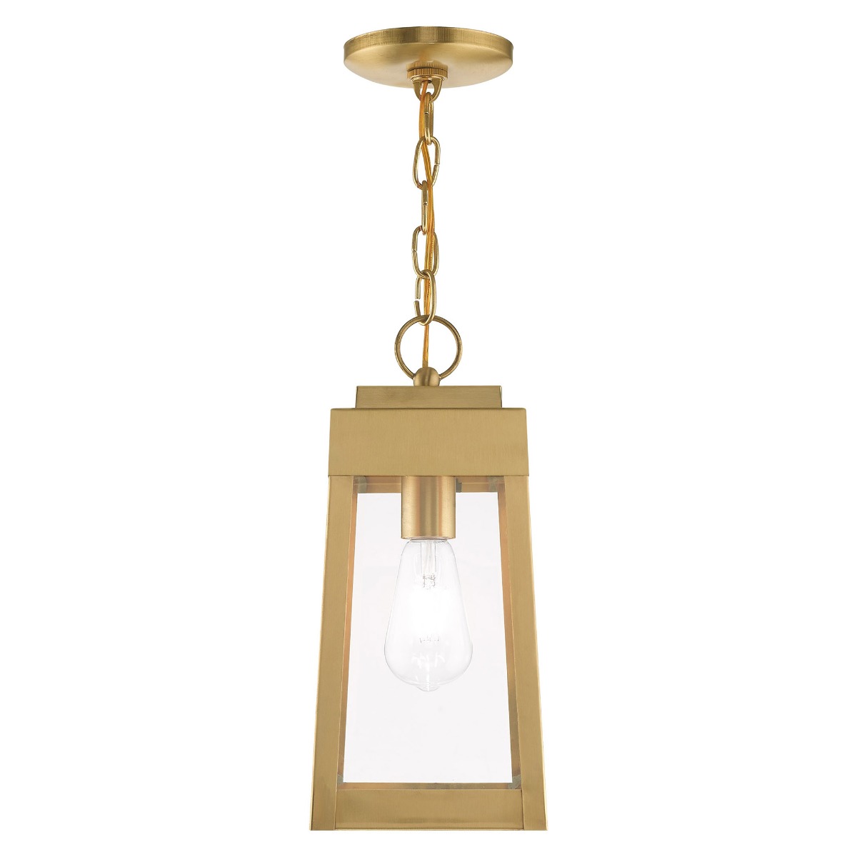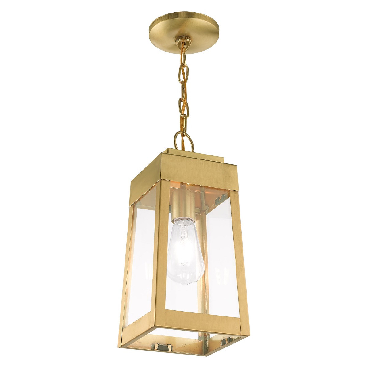 This updated industrial design comes in a tapering solid brass satin brass frame with a sleek, straight-lined look and features clear glass panels.