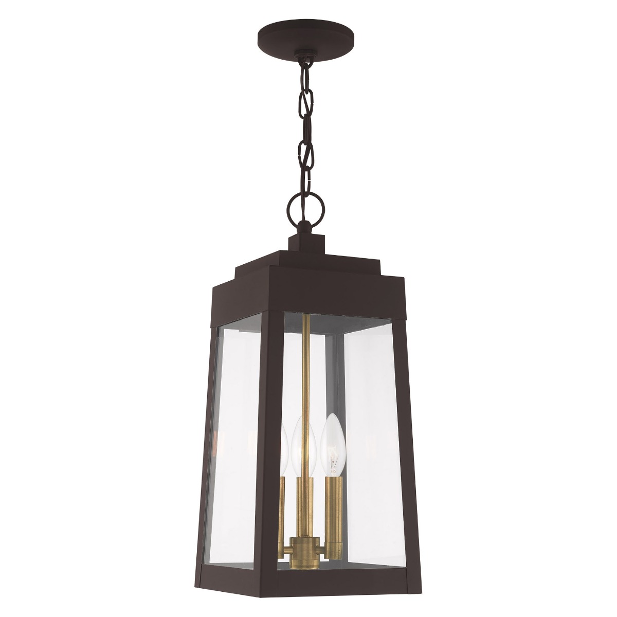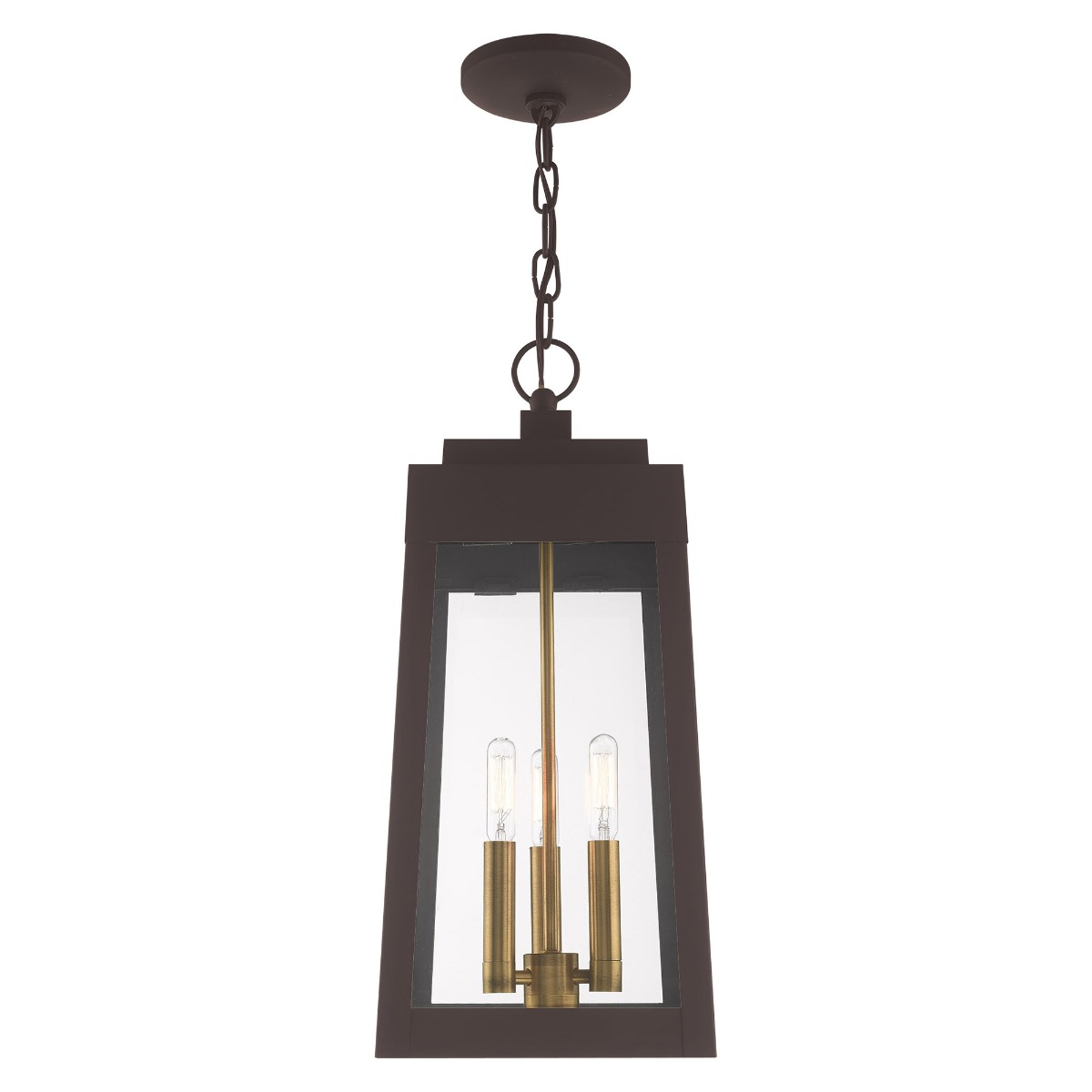 This updated industrial design comes in a tapering solid brass bronze frame with a sleek, straight-lined look and features clear glass