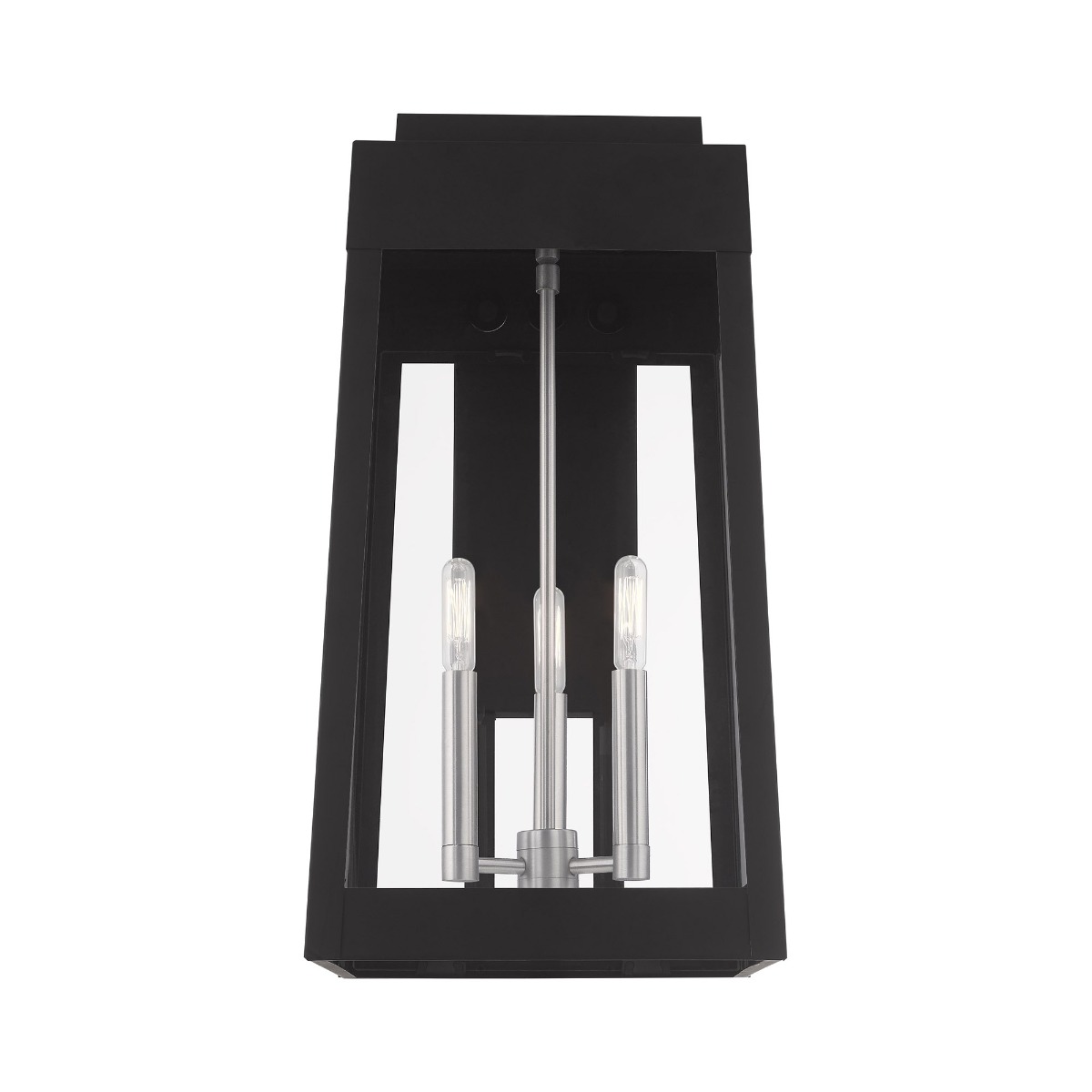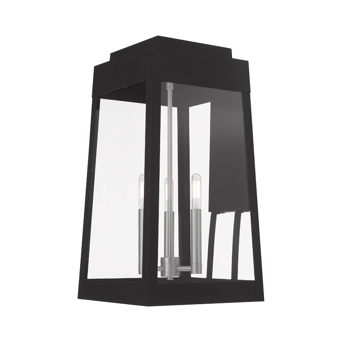 This updated industrial design comes in a tapering solid brass black frame with a sleek, straight-lined look. Clear glass panels offer a full view of the brushed nickel accents, that will house the bulb of your choice.