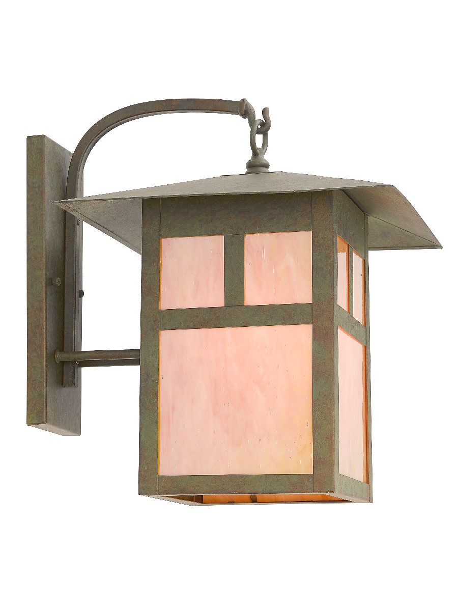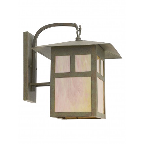 Bright, iridescent tiffany glass and bold lines put a fresh spin on a classic look in this beautiful Montclair Mission style outdoor wall lantern. Made from solid brass and finished in verde patina, the top hanging lantern is attached to the backplate by a graceful, curved arm. T-bar overlay linear details on the frame give it an architectural window-inspired look.