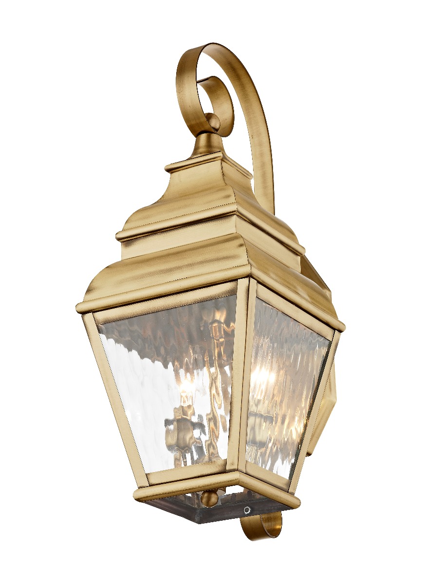 Finished in antique brass with clear water glass, this outdoor wall lantern offers plenty of stylish illumination for your home's exterior.