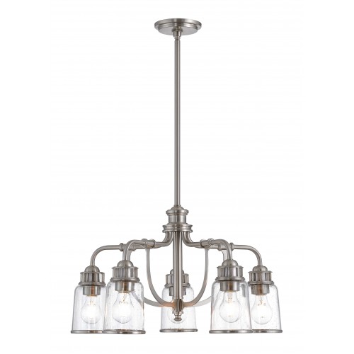 Reminiscent of turn of the 19th century lighting, the Lawrenceville collection features a retro industrial design with a brushed nickel finish and a clear seeded glass.