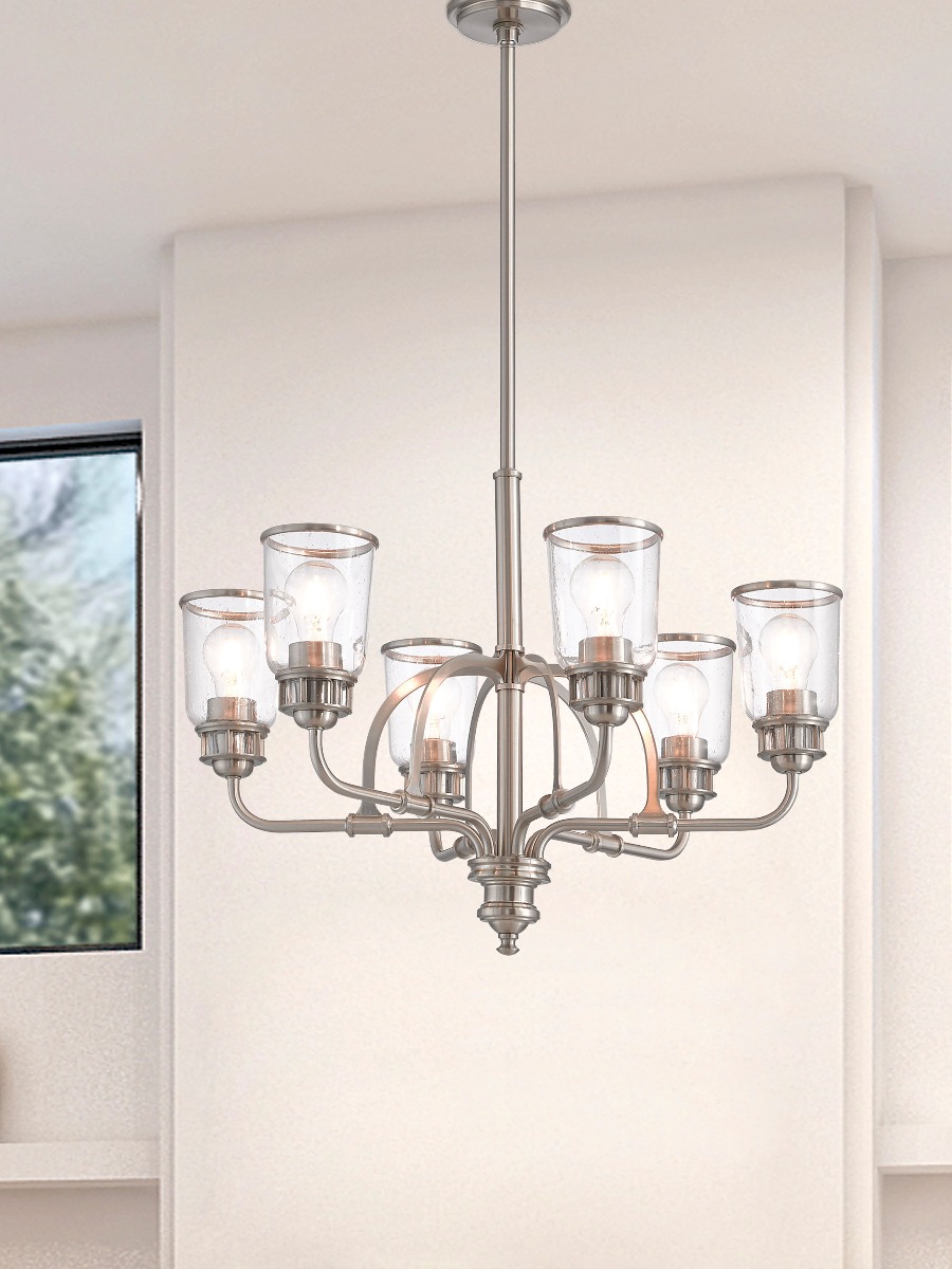 Reminiscent of turn of the 19th century lighting, the Lawrenceville collection features a retro industrial design with a brushed nickel finish and a clear seeded glass.