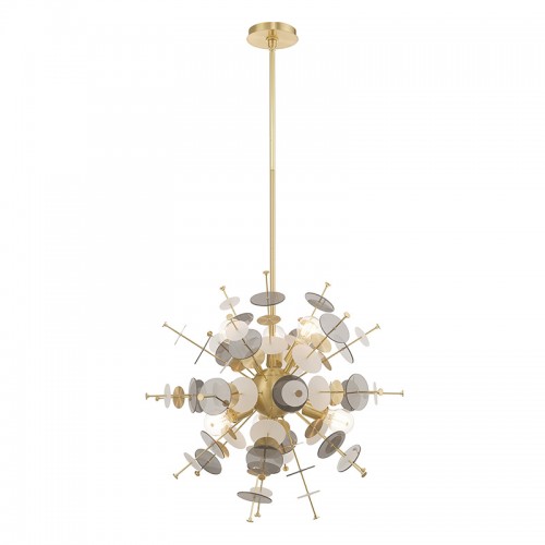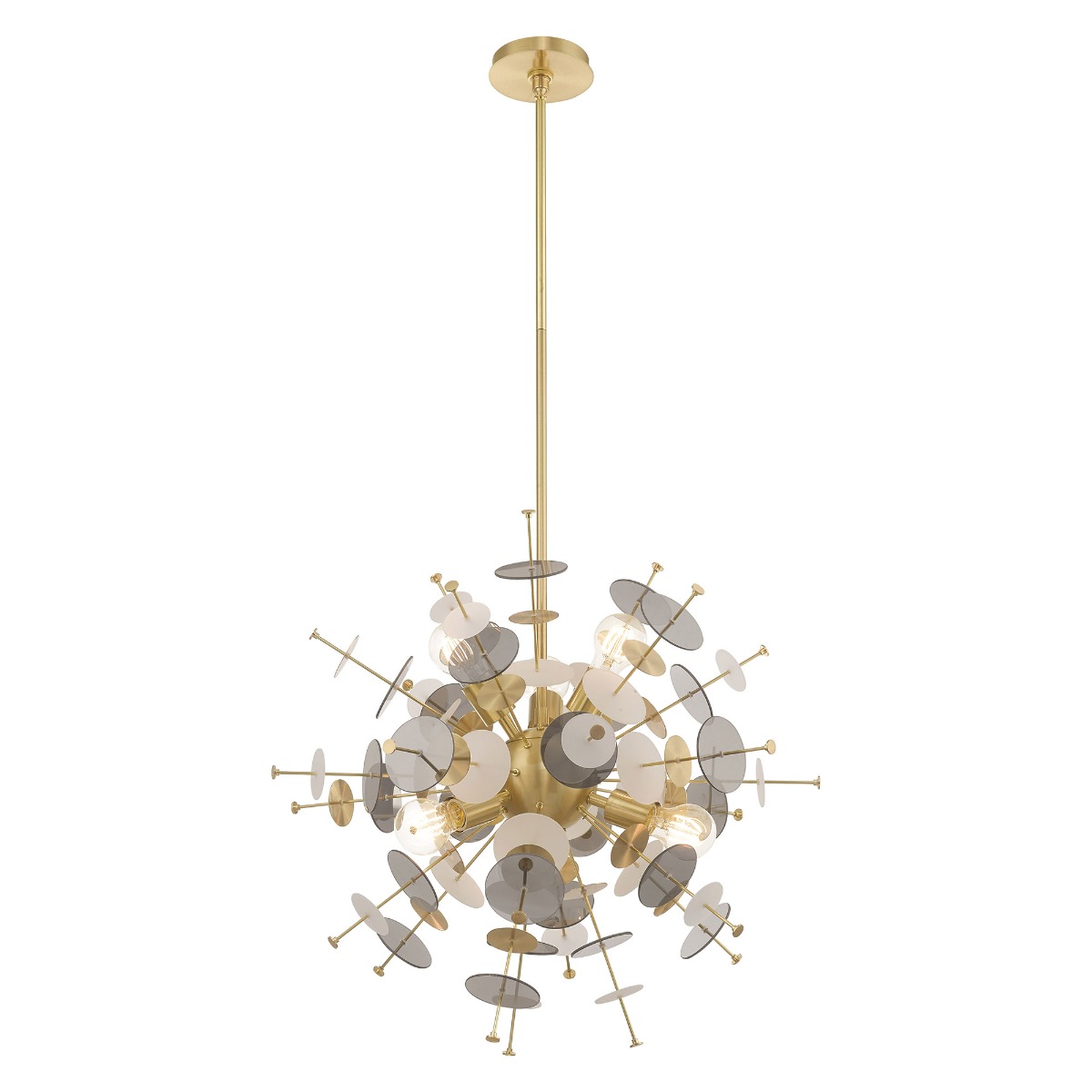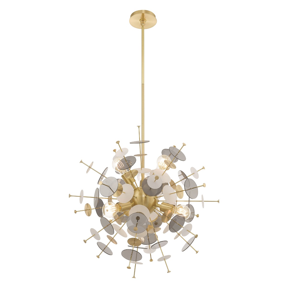 Cast a luxurious glow over your room with this satin brass six light pendant chandelier. It has beautiful geometric glass discs that will add dimension to any room. This Art Deco-inspired design features a satin brass finish for an up-scaled taste of class.