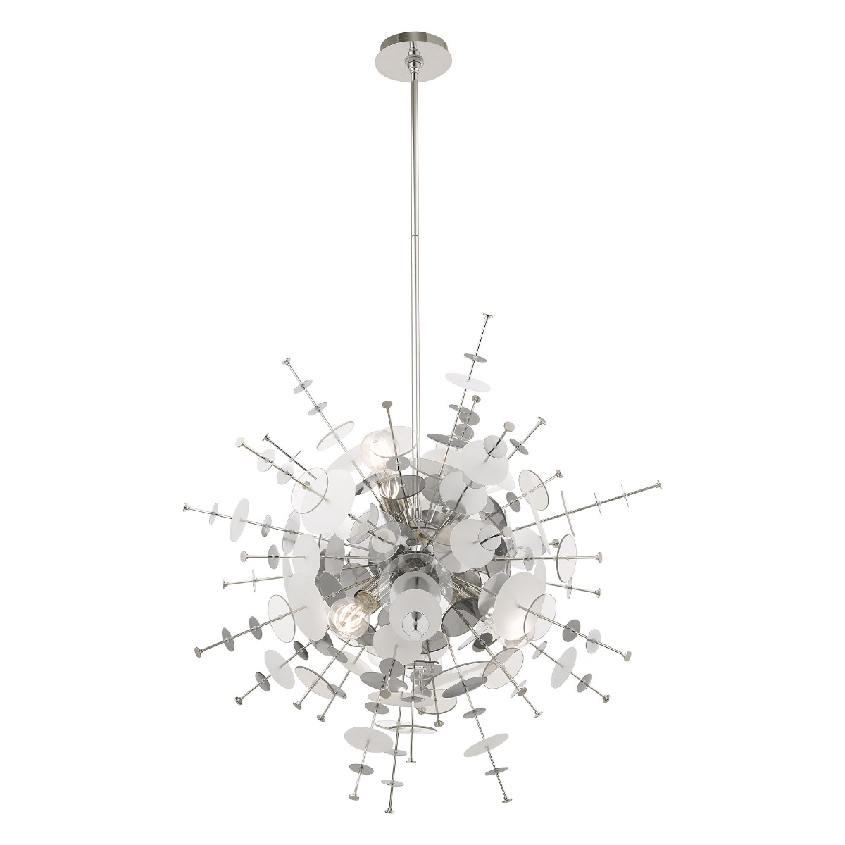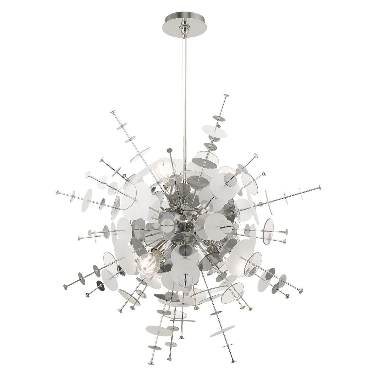 Cast a luxurious glow over your room with this polished chrome six light pendant chandelier. It has beautiful geometric glass discs that will add dimension to any room. This Art Deco-inspired design features a polished chrome finish for an up-scaled taste of class.